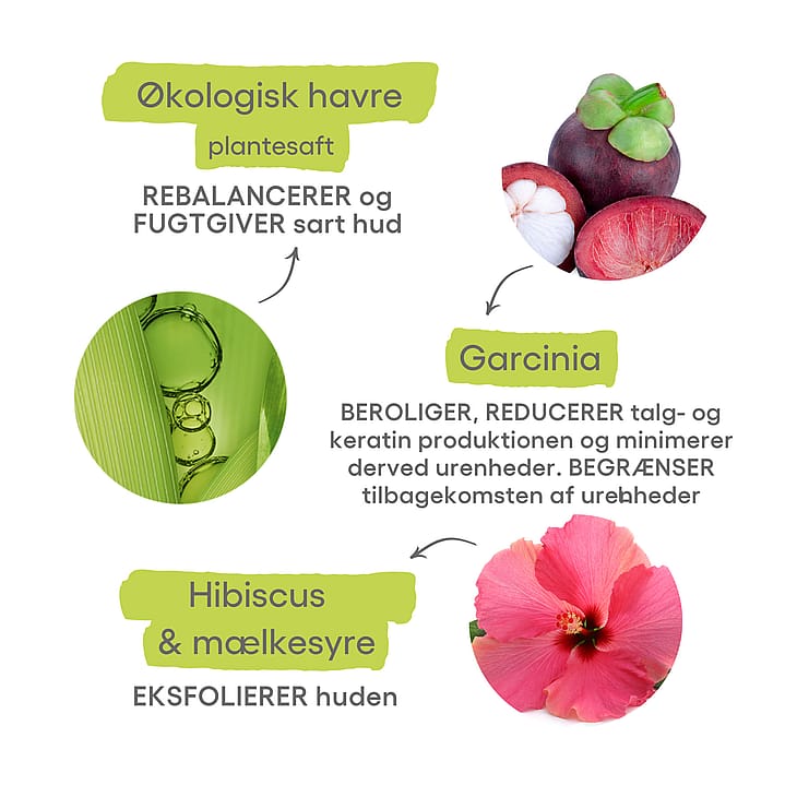 - Garnicia Mangostana: Reducerer talg- og keratinproduktion for hermed at minimere urenheder og opretholder balancen i mikrobiomet for at begrænse tilbagekomsten af urenheder