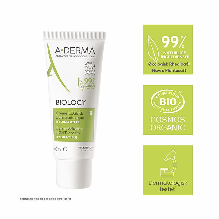 BIOLOGY Light Cream har en let og frisk tekstur, der fugter huden i op til 24 timer og styrker hudbarrieren. Cremen indeholder det økologiske Rhealba® Havre plantesaft og mælkebøtteekstrakt, som balancerer, fugter og beskytter huden aktivt.
