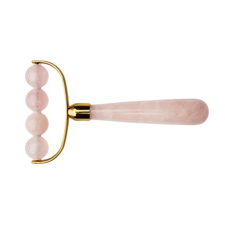 Kugle rulle til krop og ansigt - ROSA KVARTS - ÆGTE NATUR KRYSTAL håndlavet med nikkefri guldfarvet messing. Rulle med 4 kugler i natur krystallen Rosa Kvarts velegnet til afspænding af kæberne samt hele kroppen.