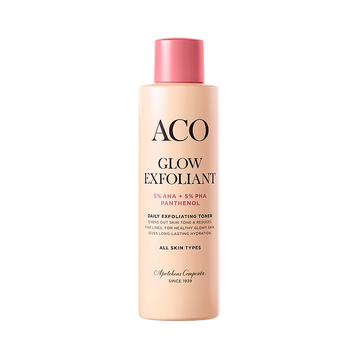 ACO Glow Exfoliant Daily Toner er en effektiv eksfolierende ansigtsvand med glykolsyre, der skånsomt fjerner døde hudceller og giver en sund glød med det samme.