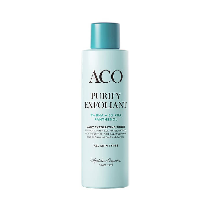 ACO Purify Exfoliant Daily Toner er en effektiv eksfolierende ansigtsvand med salicylsyre, der skånsomt fjerner døde hudceller og giver en sund hud i balance.