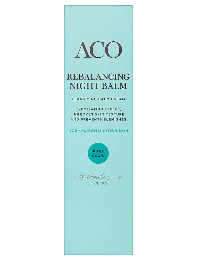 ACO Pure Glow Rebalancing Night Balm er en nærende natcreme, der er specielt tilpasset til normal og kombineret hud. ACO Pure GLow Rebalancing Night Balm mindsker de første tegn på ældning og reducerer urenheder, samtidig med at det har en afbalancerende virkning. Dette giver en smidig og ren hud med synligt reducerede linjer og en naturlig glød.