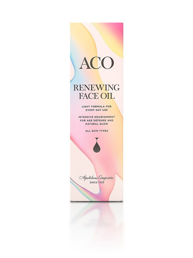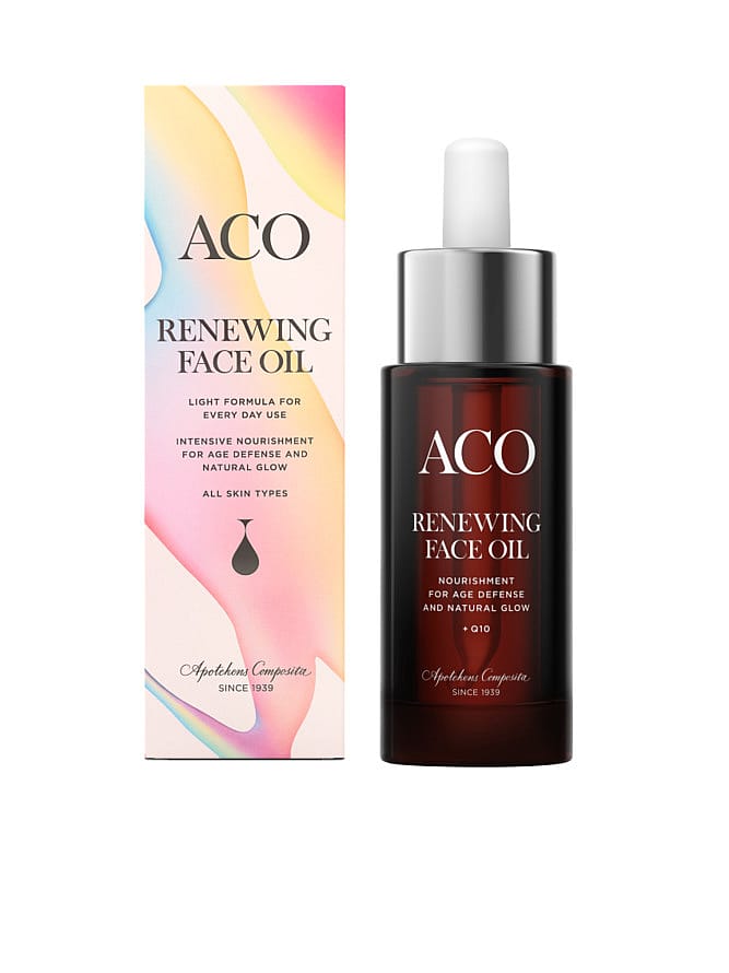 ACO Renewing Face Oil er en ansigtsolie som giver intens næring med en unik blanding af flere naturlige olier, der giver en behagelig og let følelse. Ansigtsolien beskytter din hud og giver den glød, samtidig med, at den efterlader huden blød og fugtig.