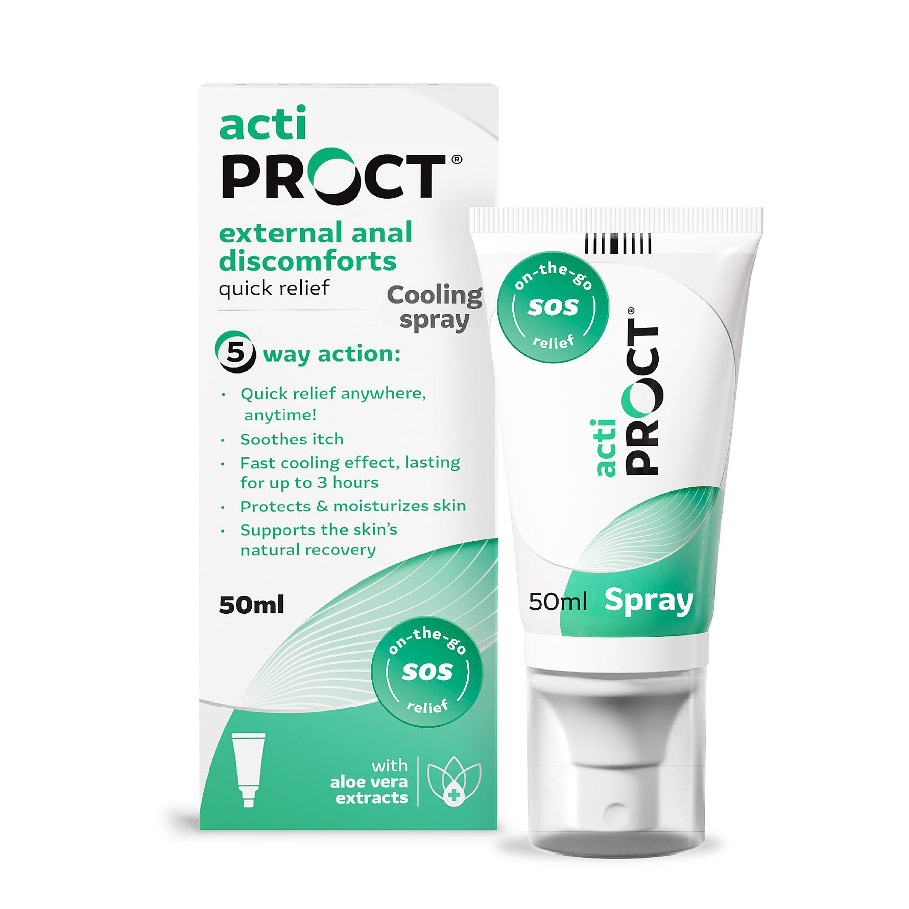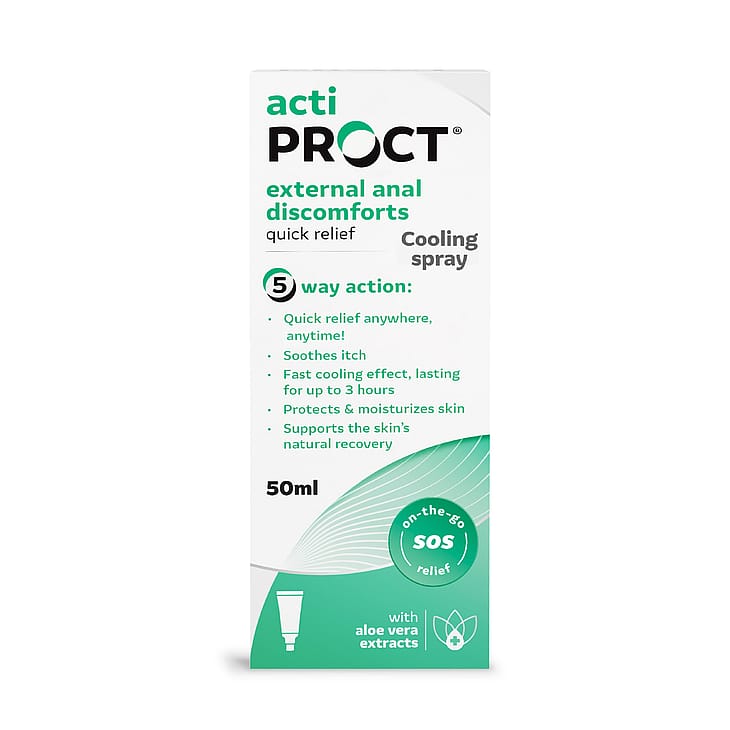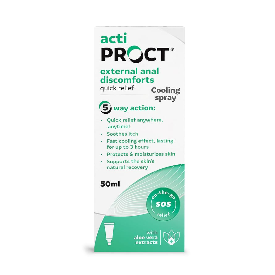 ActiProct® Cooling Spray giver hurtig lindring mod ydre rektale gener – hvor som helst, når som helst. Det naturlige 2QR-kompleks fra naturlig aloe vera giver en hurtigt kølende effekt, der varer i op til 3 timer. ActiProct® Sprayformula udmærker sig ved sine unikke kølende, beroligende og kløestillende egenskaber.