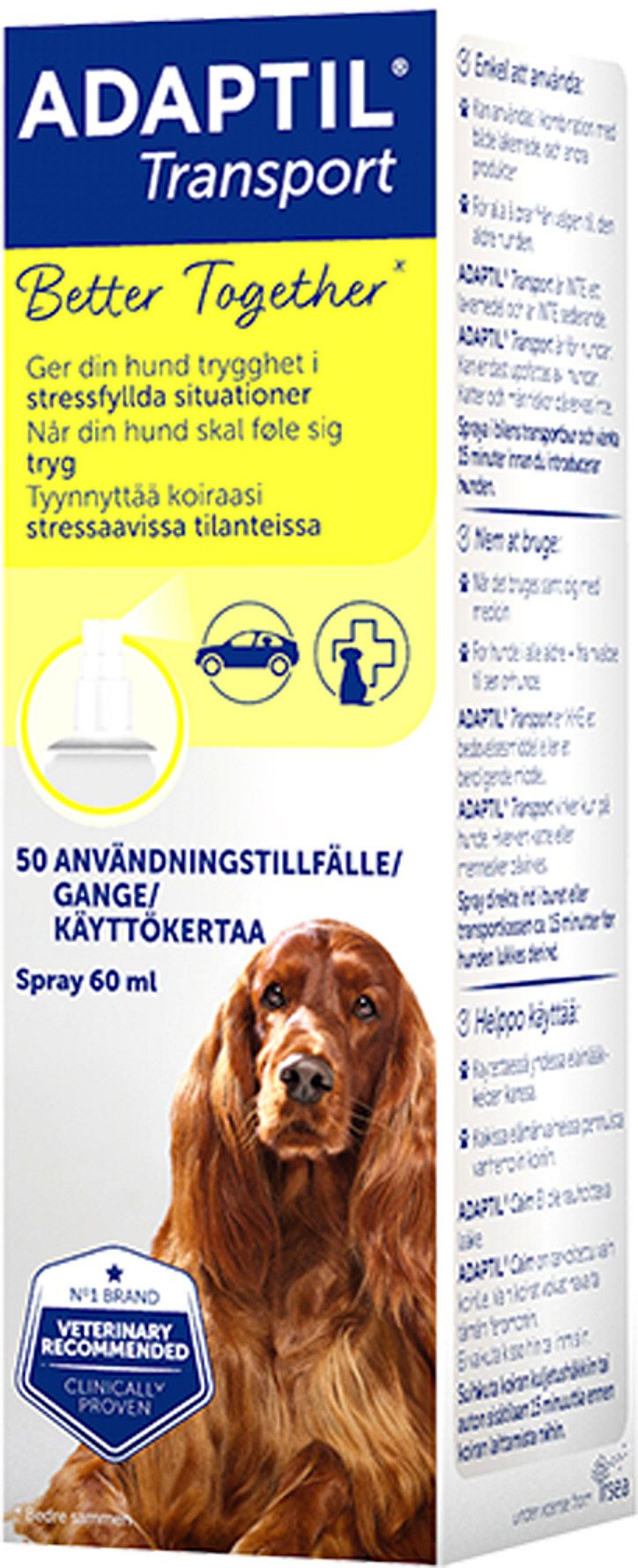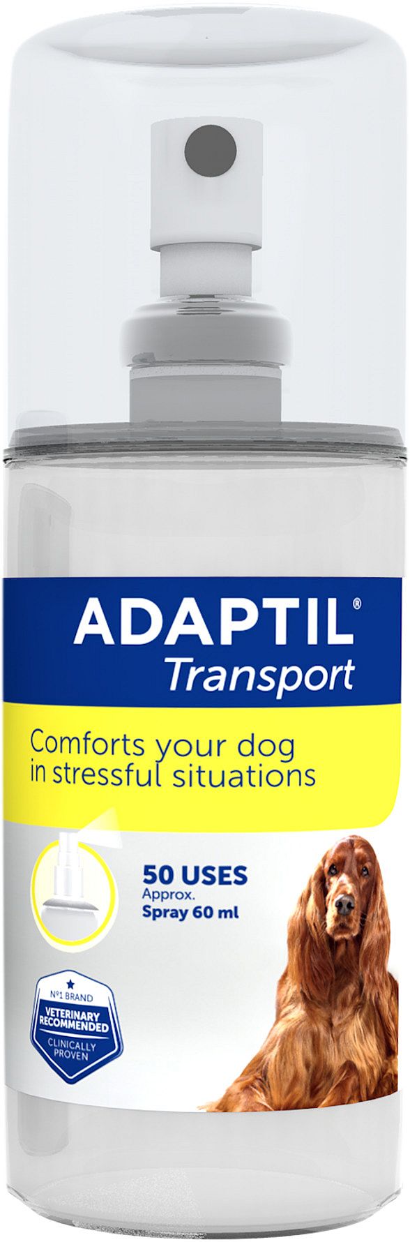 Fås også i en mindre, rejsevenlig udgave, ADAPTIL Transport Spray 20 ml, der passer i tasken eller handskerummet, så du altid har den lige ved hånden.
