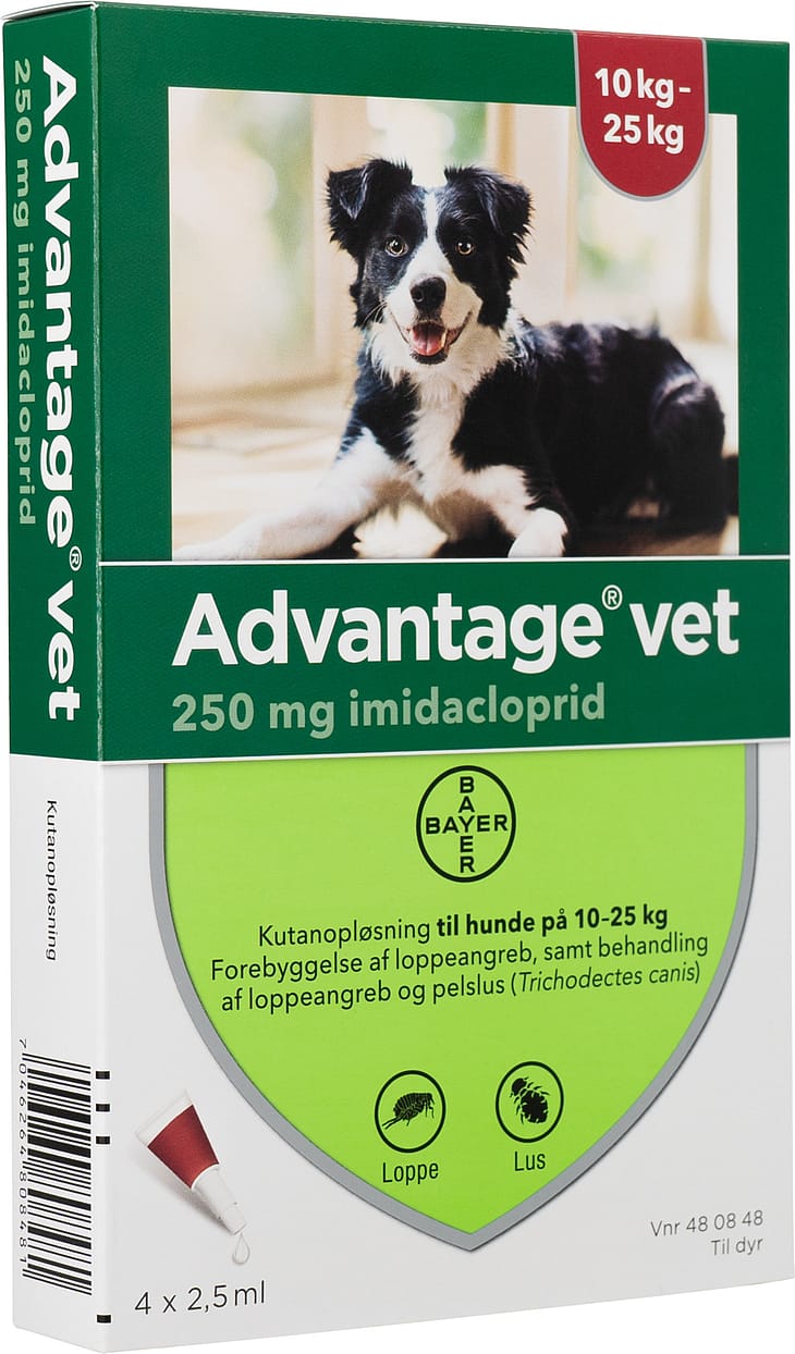 Advantage® vet. kutanopløsning til hund og kat (imidacloprid)Indikation: Til forebyggelse og behandling af lopper på hunde og katte samt til behandling af pelslus (Trichodectes canis) på hunde. Lopper på hunde dør indenfor 1 døgn efter behandling. En behandling forebygger yderligere loppeangreb i 4 uger på hund og 3-4 uger på kat.Præparatet kan anvendes som en del af behandlingsstrategien til kontrol af loppebetinget allergisk dermatitis, hvor diagnosen er stillet af dyrlægen. Dosering hund: Under 4 kg: 1 pipette a 0,4 ml; 4 - 10 kg: 1 pipette a 1,0 ml; 10 - 25 kg: 1 pipette a 2,5 ml; 25 - 40 kg: 1 pipette a 4,0 ml; over 40 kg: 2 pipetter a 4,0 ml. Reinfestation af nye lopper fra omgivelser kan fortsætte i 6 uger eller længere efter startbehandlingen. Ved pelslus anbefales dyrlægetjek efter 30 dage, da nogle dyr kræver en 2. behandling.Dosering kat: Under 4 kg: 1 pipette a 0,4 ml; 4 kg og derover: 1 pipette a 0,8 ml. Reinfestation af nye lopper fra omgivelser kan fortsætte i 6 uger eller længere efter startbehandlingen. Mere end én behandling kan derfor være nødvendig, hvis antallet af lopper i omgivelserne er stort.Kontraindikationer: Diende hvalpe og killinger under 8 uger behandles ikke. Bør ikke anvendes til dyr med kendt overfølsomhed over for imidacloprid eller nogen af hjælpestofferne.Forsigtighedsregler: Til udvortes brug. Må ikke gives oralt. Undgå at pipettens indhold kommer i kontakt med øjne eller mund på dyret. Tillad ikke nyligt behandlede dyr at slikke på hinanden. Vask hænderne grundigt efter behandling af dyr. Ved spild på huden vask med vand og sæbe. Personer med kendt hudoverfølsomhed kan være særligt følsomme for lægemidlet. Undgå at få produktet i mund og øjne. Spis, drik og ryg ikke under påføringen. Hvis præparatet kommer i øjnene ved et uheld, gennemskylles de med vand. Søg lægehjælp, hvis hud- eller øjenirritationer varer ved, eller hvis præparatet ved et uheld sluges. Præparatet er skadeligt for organismer i vandet og behandlede dyr bør ikke komme i kontakt med overfladevand de første 48 timer efter behandling.Bivirkninger: Præparatet smager bittert, og spytsekretion kan lejlighedsvist forekomme, hvis dyret slikker på applikationsstedet umiddelbart efter behandling. Dette er ikke tegn på forgiftning og forsvinder indenfor nogle minutter uden behandling. I meget sjældne tilfælde kan hudreaktioner så som hårtab, rødmen af huden, kløen og sår opstå. Nervøsitet og desorientering kan også forekomme. Savlen og nervøse tegn så som ataxi, tremor og depression har været observeret.Andre informationer: Opløsningsmidlet i Advantage® vet. kan forårsage pletter på visse materialer, såsom plast, læder, tekstiler og behandlede overflader. Lad derfor væsken tørre, inden kontakt med disse materialer tillades. For yderligere information læs indlægssedlen. Pakninger: Advantage® vet. pakninger med 4 pipetter. Til kat 0,4 ml - 0,8 ml. Til hund 0,4 ml - 1,0 ml - 2,5 ml – 4,0 ml. Forhandles af: Elanco Denmark ApS, Lautrupvang 12, 2750 Ballerup. Telefon 45 26 60 60Baseret på SPC dateret den 14. juni 2021.DKmiB0621