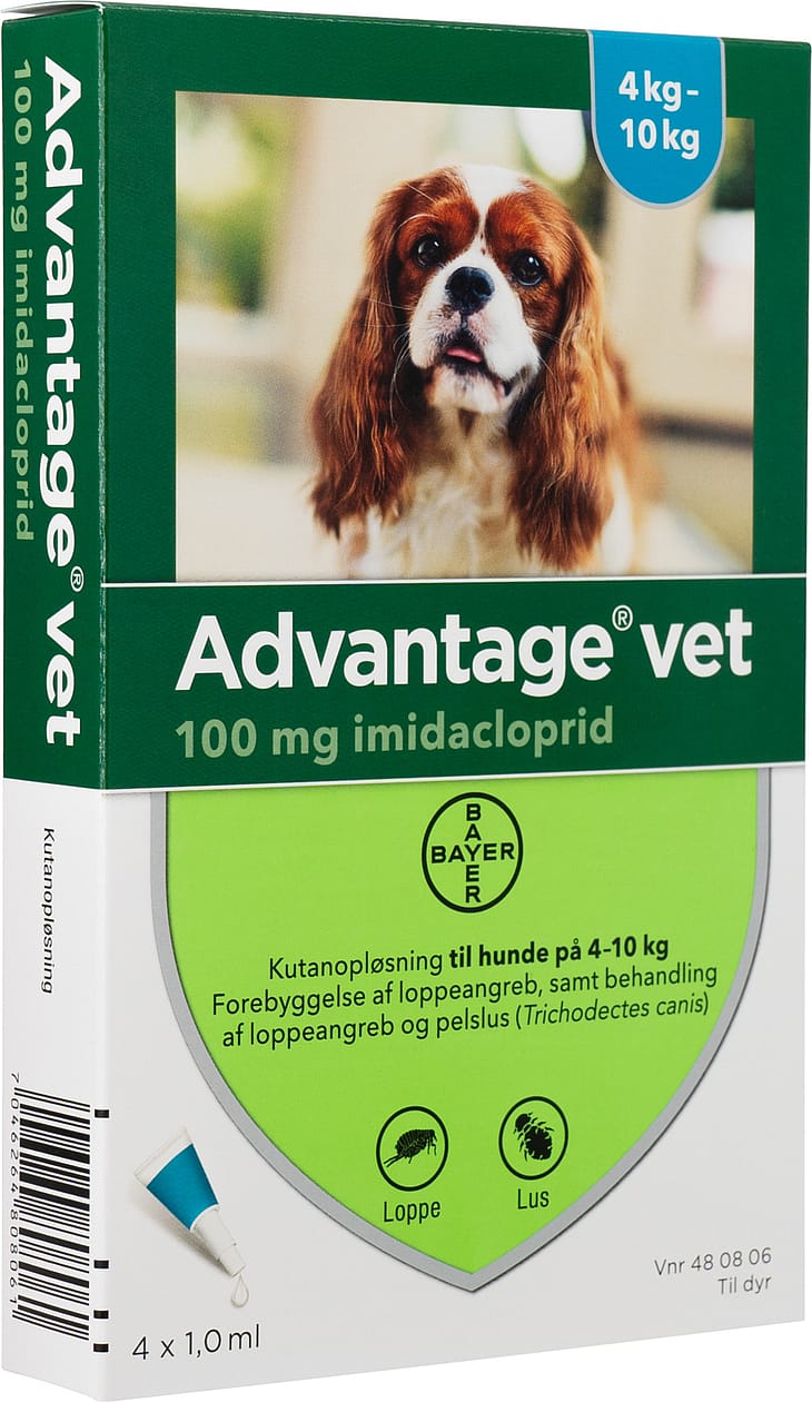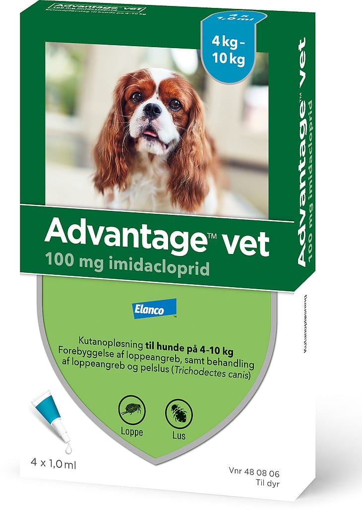 Advantage® vet. kutanopløsning til hund og kat (imidacloprid)Indikation: Til forebyggelse og behandling af lopper på hunde og katte samt til behandling af pelslus (Trichodectes canis) på hunde. Lopper på hunde dør indenfor 1 døgn efter behandling. En behandling forebygger yderligere loppeangreb i 4 uger på hund og 3-4 uger på kat.Præparatet kan anvendes som en del af behandlingsstrategien til kontrol af loppebetinget allergisk dermatitis, hvor diagnosen er stillet af dyrlægen. Dosering hund: Under 4 kg: 1 pipette a 0,4 ml; 4 - 10 kg: 1 pipette a 1,0 ml; 10 - 25 kg: 1 pipette a 2,5 ml; 25 - 40 kg: 1 pipette a 4,0 ml; over 40 kg: 2 pipetter a 4,0 ml. Reinfestation af nye lopper fra omgivelser kan fortsætte i 6 uger eller længere efter startbehandlingen. Ved pelslus anbefales dyrlægetjek efter 30 dage, da nogle dyr kræver en 2. behandling.Dosering kat: Under 4 kg: 1 pipette a 0,4 ml; 4 kg og derover: 1 pipette a 0,8 ml. Reinfestation af nye lopper fra omgivelser kan fortsætte i 6 uger eller længere efter startbehandlingen. Mere end én behandling kan derfor være nødvendig, hvis antallet af lopper i omgivelserne er stort.Kontraindikationer: Diende hvalpe og killinger under 8 uger behandles ikke. Bør ikke anvendes til dyr med kendt overfølsomhed over for imidacloprid eller nogen af hjælpestofferne.Forsigtighedsregler: Til udvortes brug. Må ikke gives oralt. Undgå at pipettens indhold kommer i kontakt med øjne eller mund på dyret. Tillad ikke nyligt behandlede dyr at slikke på hinanden. Vask hænderne grundigt efter behandling af dyr. Ved spild på huden vask med vand og sæbe. Personer med kendt hudoverfølsomhed kan være særligt følsomme for lægemidlet. Undgå at få produktet i mund og øjne. Spis, drik og ryg ikke under påføringen. Hvis præparatet kommer i øjnene ved et uheld, gennemskylles de med vand. Søg lægehjælp, hvis hud- eller øjenirritationer varer ved, eller hvis præparatet ved et uheld sluges. Præparatet er skadeligt for organismer i vandet og behandlede dyr bør ikke komme i kontakt med overfladevand de første 48 timer efter behandling.Bivirkninger: Præparatet smager bittert, og spytsekretion kan lejlighedsvist forekomme, hvis dyret slikker på applikationsstedet umiddelbart efter behandling. Dette er ikke tegn på forgiftning og forsvinder indenfor nogle minutter uden behandling. I meget sjældne tilfælde kan hudreaktioner så som hårtab, rødmen af huden, kløen og sår opstå. Nervøsitet og desorientering kan også forekomme. Savlen og nervøse tegn så som ataxi, tremor og depression har været observeret.Andre informationer: Opløsningsmidlet i Advantage® vet. kan forårsage pletter på visse materialer, såsom plast, læder, tekstiler og behandlede overflader. Lad derfor væsken tørre, inden kontakt med disse materialer tillades. For yderligere information læs indlægssedlen. Pakninger: Advantage® vet. pakninger med 4 pipetter. Til kat 0,4 ml - 0,8 ml. Til hund 0,4 ml - 1,0 ml - 2,5 ml – 4,0 ml. Forhandles af: Elanco Denmark ApS, Lautrupvang 12, 2750 Ballerup. Telefon 45 26 60 60Baseret på SPC dateret den 14. juni 2021.DKmiB0621