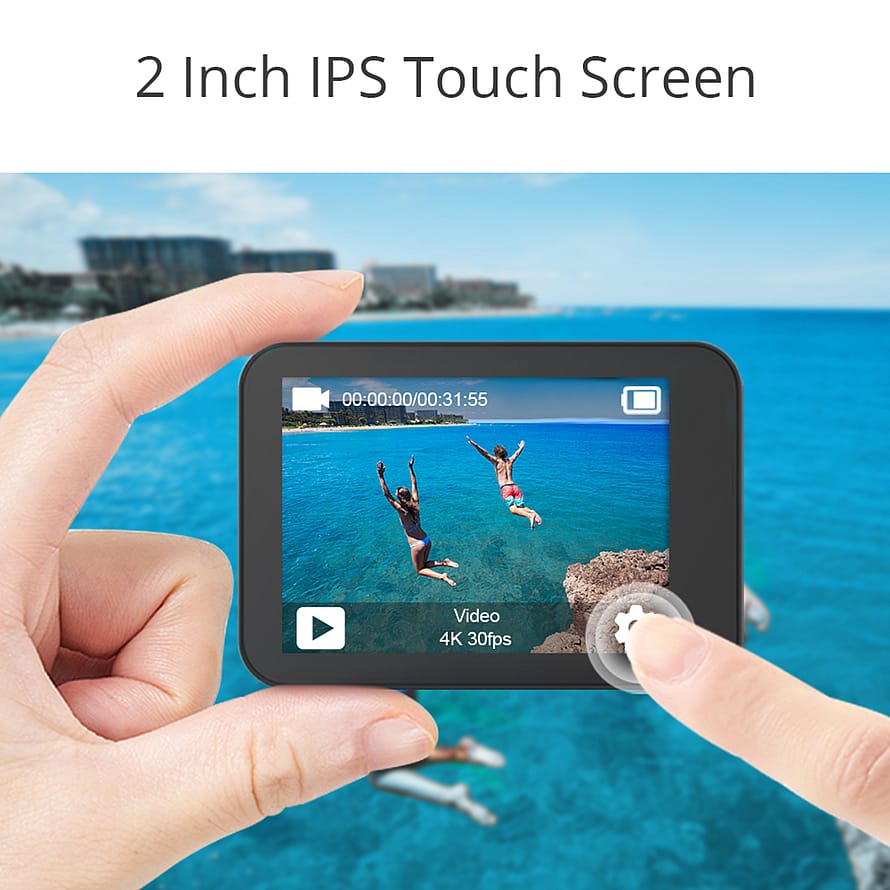 Med Akaso V50X-actionkameraet kan du optage 4K-video med 30 billeder pr. sekund og 20 MP-fotos, mens du nyder godt af et væld af funktioner som touchscreen-understøttelse, WiFi-forbindelse. og kan holde til en dybde helt ned til 40M med det vandtætte etui (medfølger i pakken) og EIS 2.0-billedstabilisering.