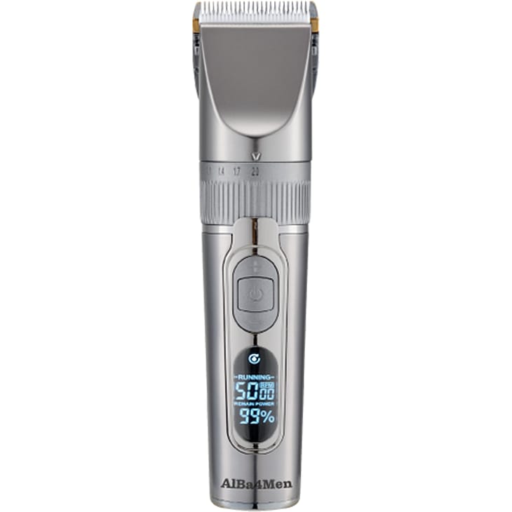 AlBa Professionel hår/skægtrimmer med skær udført i Titanium(fast) og keramik(bevægeligt). På klipperen har du mulighed for at justere hastigheden på skæret fra 5.000-7.000. omdrejninger.