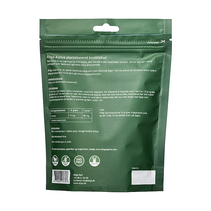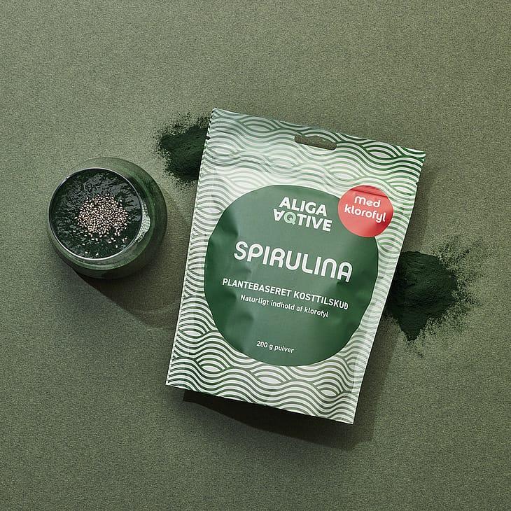 Aliga Aqtives Spirulina Pulver er særligt god til brug i smoothies og diverse drikke. Du kan eksempelvis prøve en lækker friskpresset juice med et grønt boost.