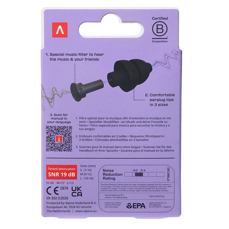 Alpine PartyPlug ørepropper er designet til musikelskere og festivalgæster, der ønsker at nyde høj musik uden at skade deres hørelse. Det specielle musikfilter giver dig mulighed for at høre musikken og snakke med vennerne, samtidig med at skadelig støj reduceres med 19 dB. De genanvendelige ørepropper kan bruges cirka 100 gange.