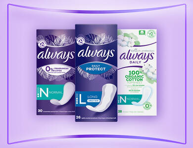 Always-produkterne er designet til, at passe til forskellige kropsformer og størrelser og til at yde beskyttelse for alle typer periodestrømme - fra en let, til en meget kraftig. Uanset om du foretrækker en hygiejnepude med vinger eller uden vinger. Alle Always bind har forskellige teknologier, der gør, at du er sikker på, at du undgår lækage i løbet af dagen eller natten. Med Always Instant Dry-system og Leakguard teknologi sikrer du dig hele døgnet.