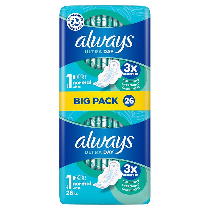 Always Ultra Normal bind (str. 1) med vinger og Instant Dry-system absorberer væske på sekunder. Bindet fastlåser væske og giver op til 100% beskyttende tryghed. Selvom Always Ultra Normal bind kun er 3 mm behageligt tynde, giver de dig uovertruffen beskyttelse under menstruationen.