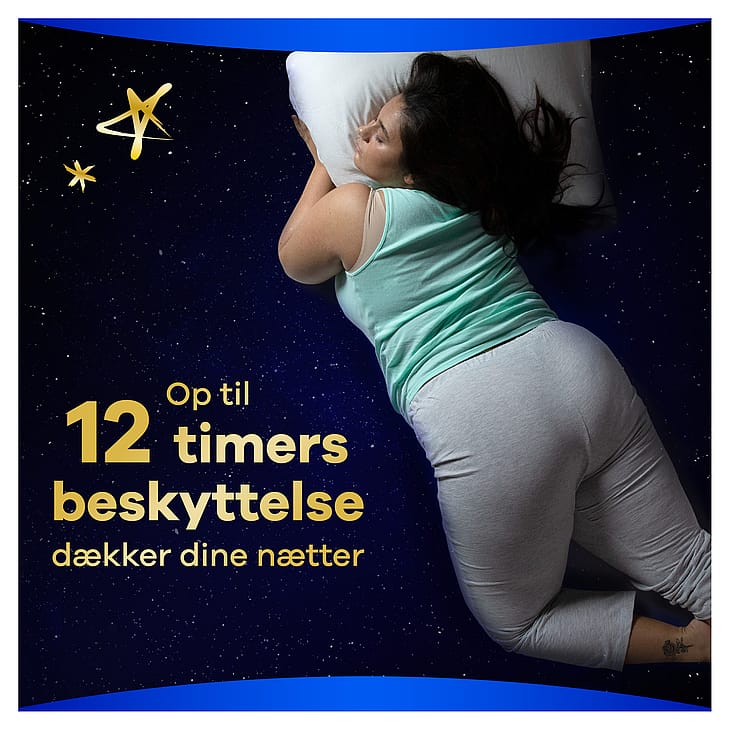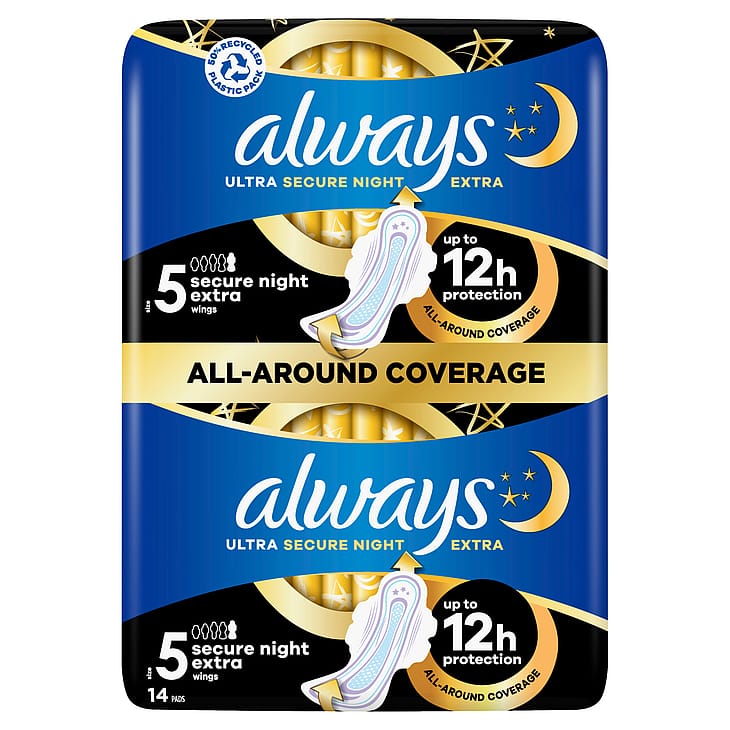 Always Ultra Secure Night Extra bind (str. 5) med vinger er designet med 3-dobbelte beskyttelsesfunktioner, så du ikke vågner og skal holde øje med lækage eller skifte bind midt om natten. 9% større foran og 85% større bagtil (vs. Always Ultra Normal str. 1) sammen med vores LeakGuard teknologi sikrer en dækning hele vejen rundt for at modvirke lækage om natten.