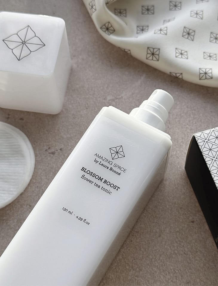 Amazing Space Blossom Boost - Flower Tea Tonic er en mild og kølig ansigtstonic med blomstervand og essentiel olie fra hibiscus rose, jasmin og ylang ylang.