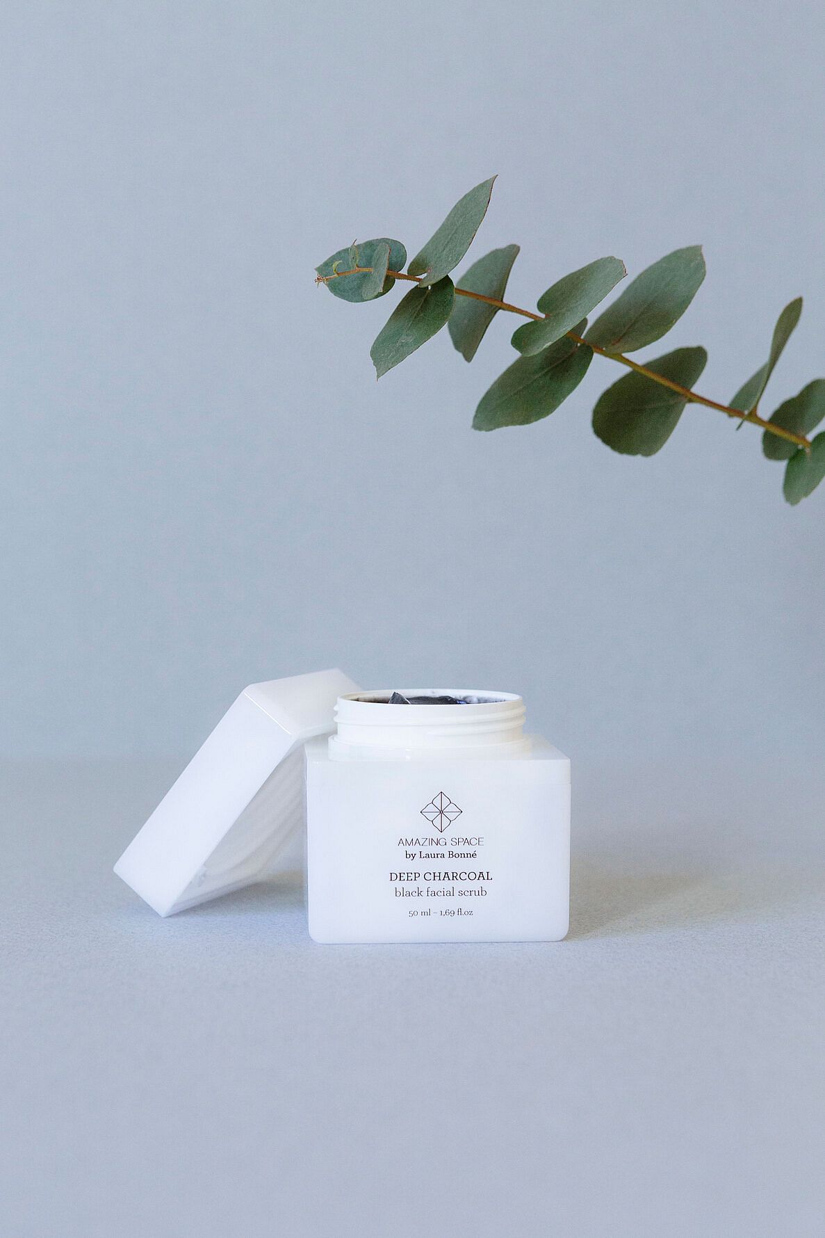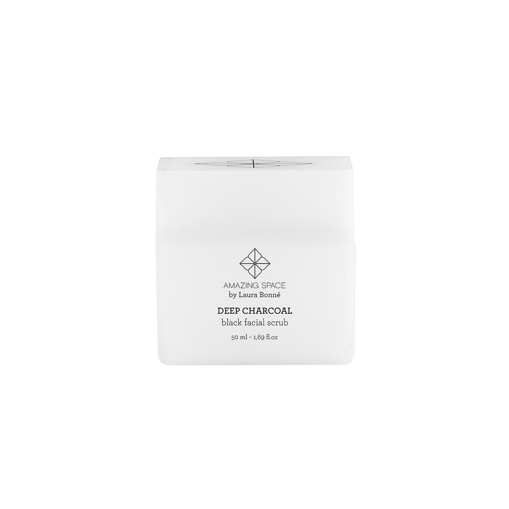 Amazing Space Deep Charcoal - Black Facial Scrub er en mikroexfolierende ansigtspeeling med dybderensende, afgiftende kul og knuste mineralske salte.