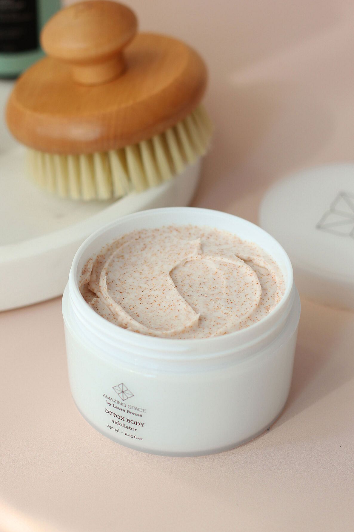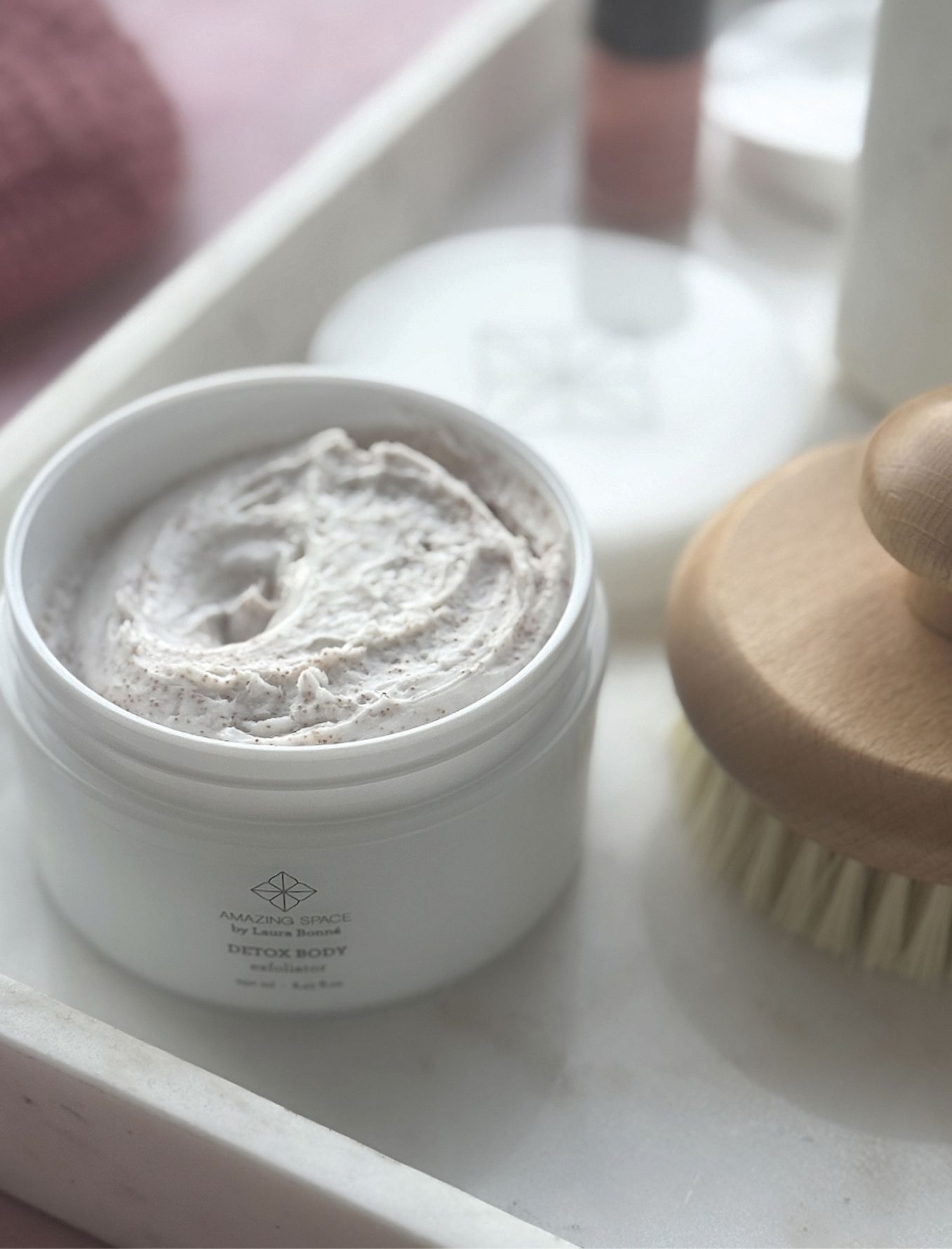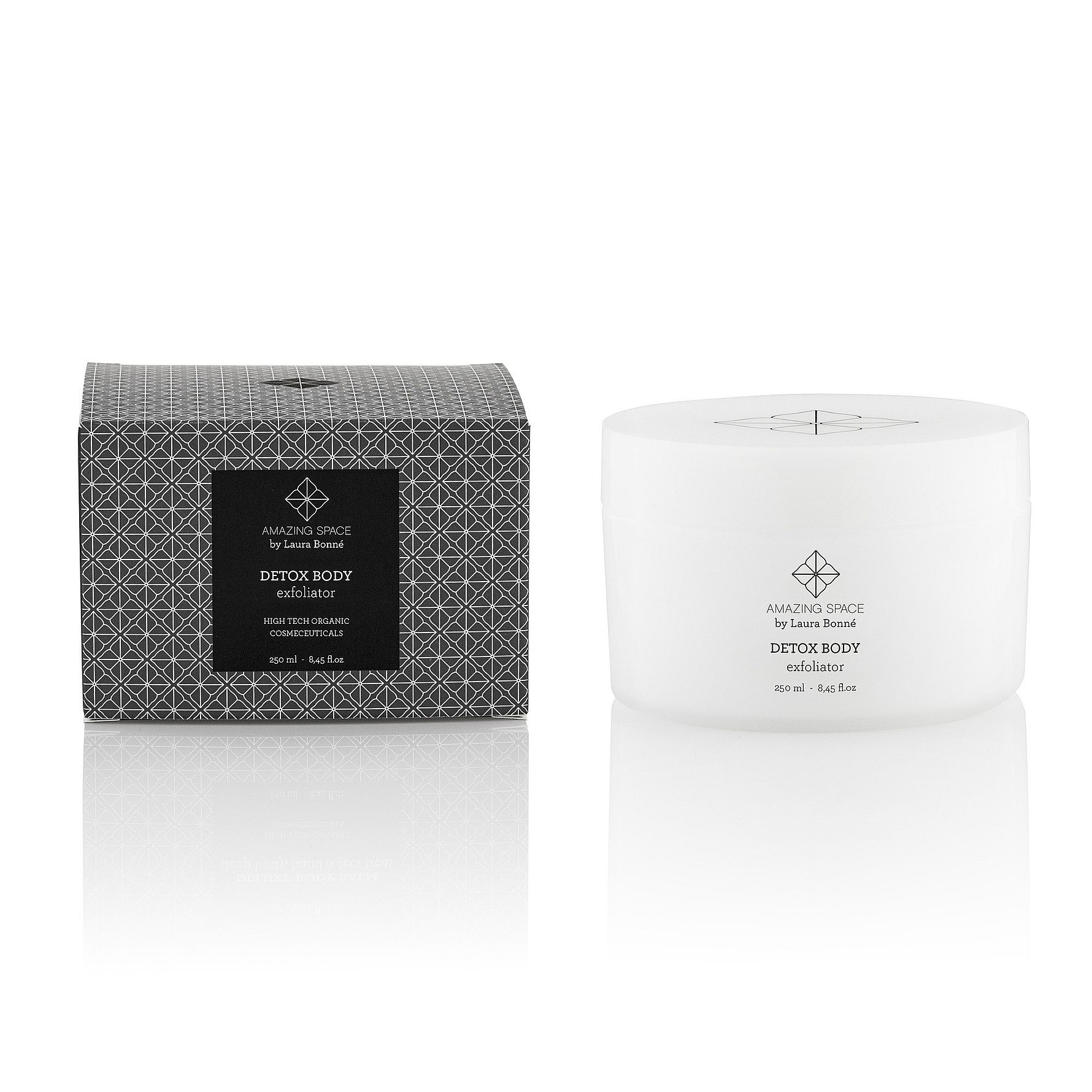 Amazing Space Detox Body Efoliator - Mint & Rosemary er en rensende og eksfolierende plantescrub med afgiftende effekt takket være havalger, abrikoskerne- og rispudder samt BHA fra pil.
