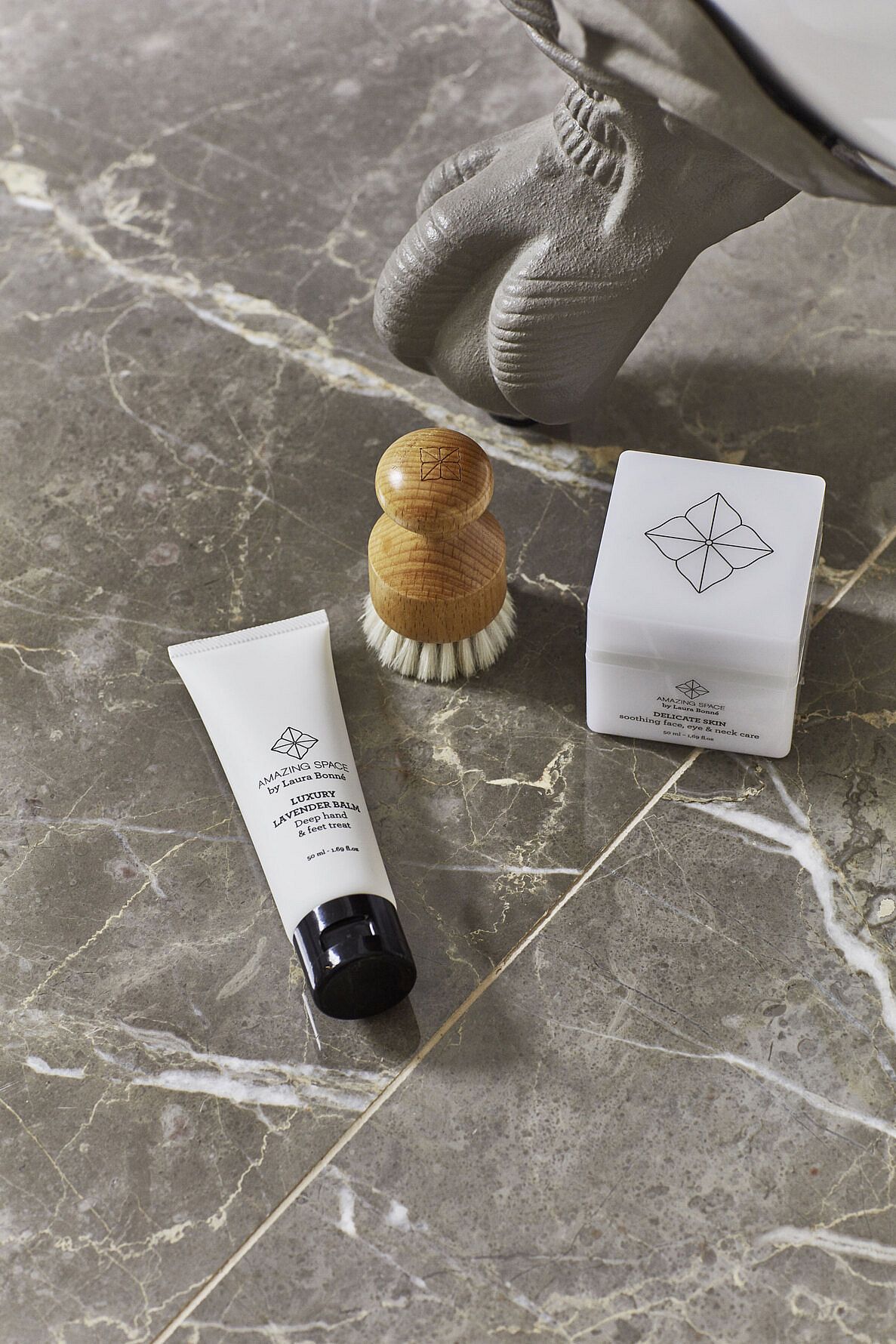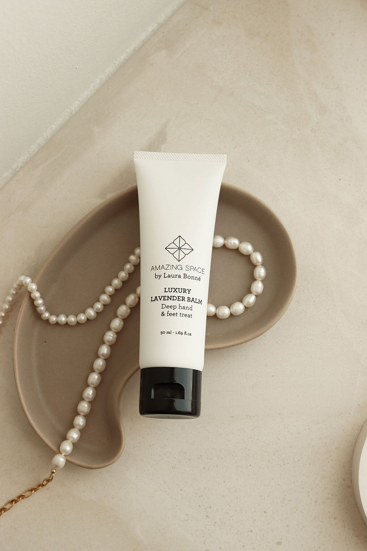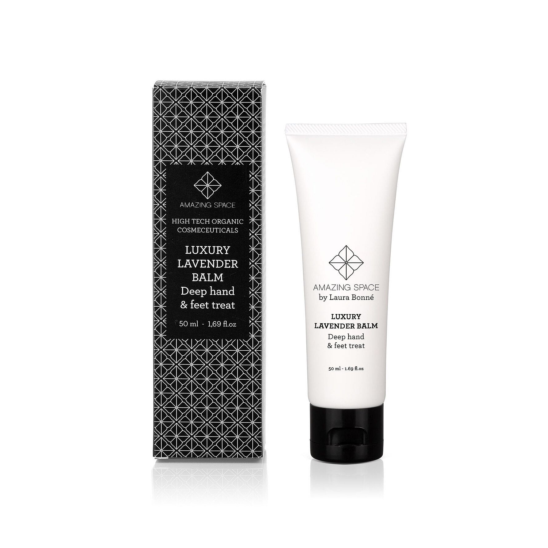 Amazing Space Luxury Lavender Balm - Deep Hand & Feet Treat er en suveræn fugtpleje til hænder og fødder, med nærende og antibakterielle essentielle olier fra rose, geranium og lavendel.