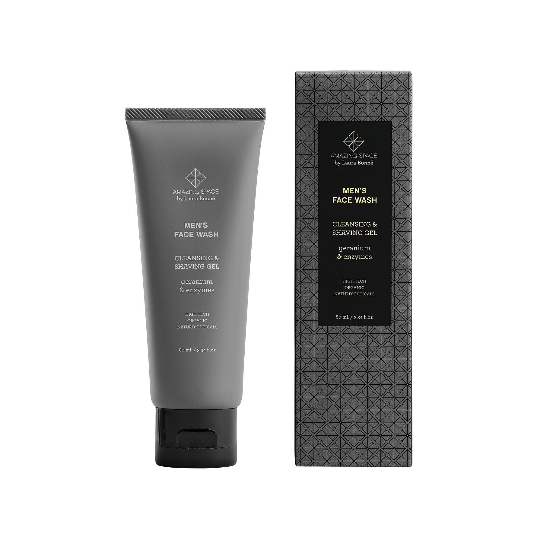 Amazing Space Men’s Face Wash - Cleansing & Shaving Gel er en mild rensegel med naturlige rensende enzymer og geranium til alle hudtyper.