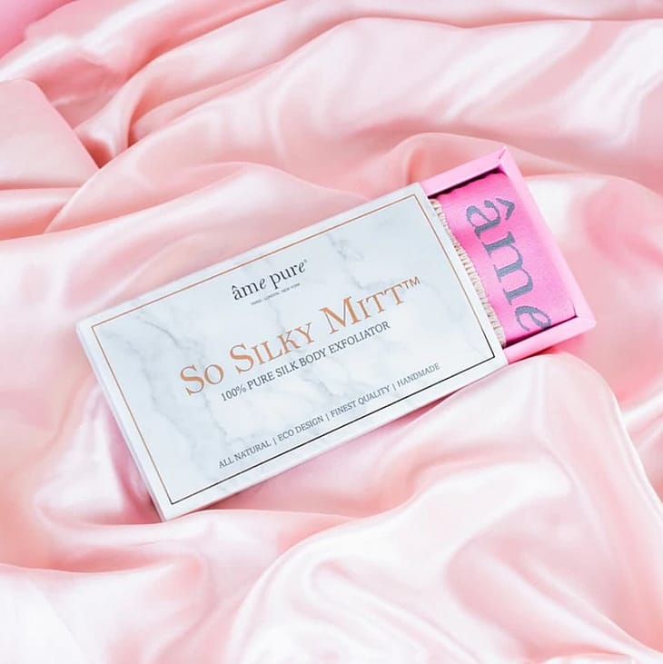 So Silky Mitt er lavet af 100% naturlig silke, og du behøver ikke sæbe eller anden form for skrub. Handsken og vand er nok i sig selv!