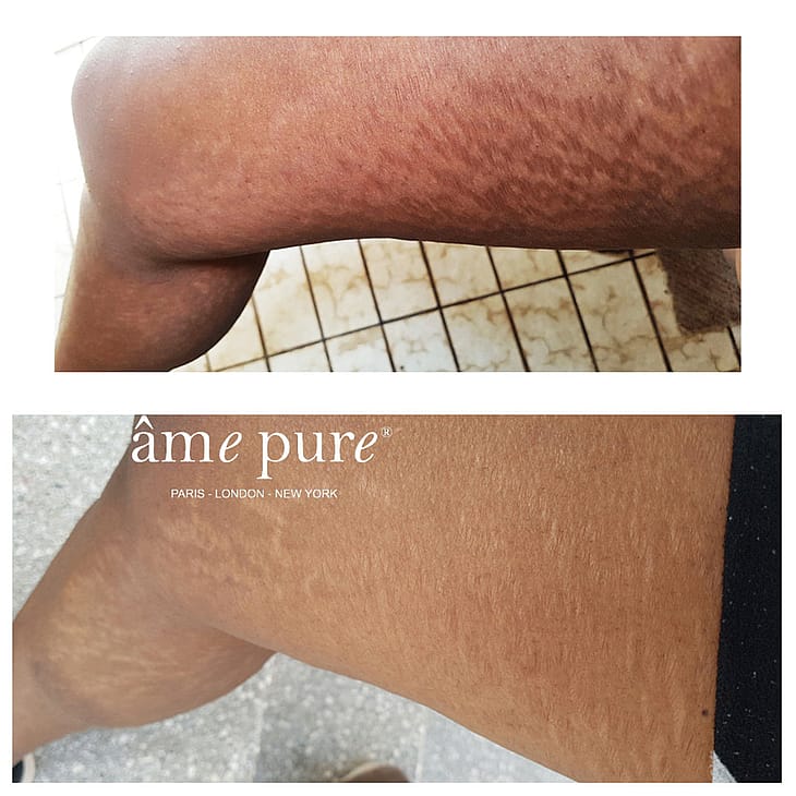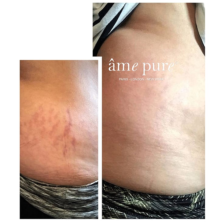 Mere end 70% reduktion af farven på strækmærkerneI gennemsnit øges hudens elastisitet med 44%Resultater af kliniske studier:30 frivillige mænd og kvinder (alder 19-35) med strækmærker på mave, lår, ryg og balder påførte âme pure® Intensive Stretch Marks Induction Therapy™ Gel 2 gange dagligt.