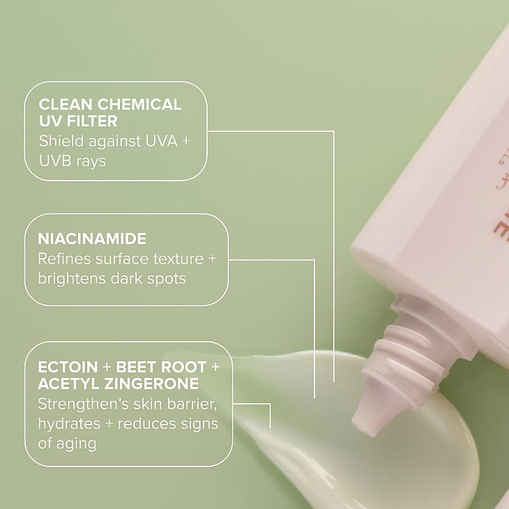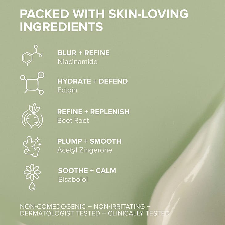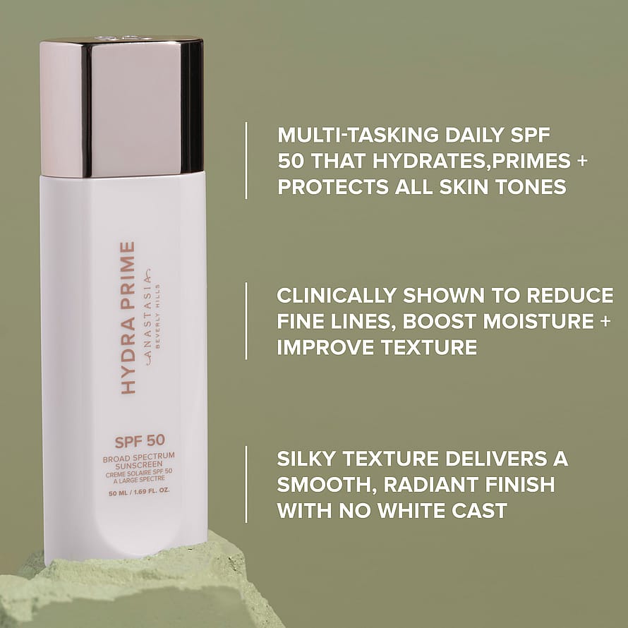 En daglig SPF 50, der fugter, primer og beskytter samtlige hudtoner. Forsøg viser, at den reducerer fine linjer, giver mere fugt og forbedrer tekstur og nuance med en glat, strålende finish uden hvide striber. Indeholder niacinamid, ectoin og rødbede, der beskytter huden og forbereder den – makeup kan tilvælges.