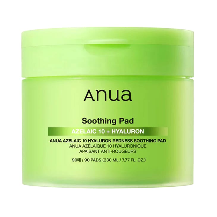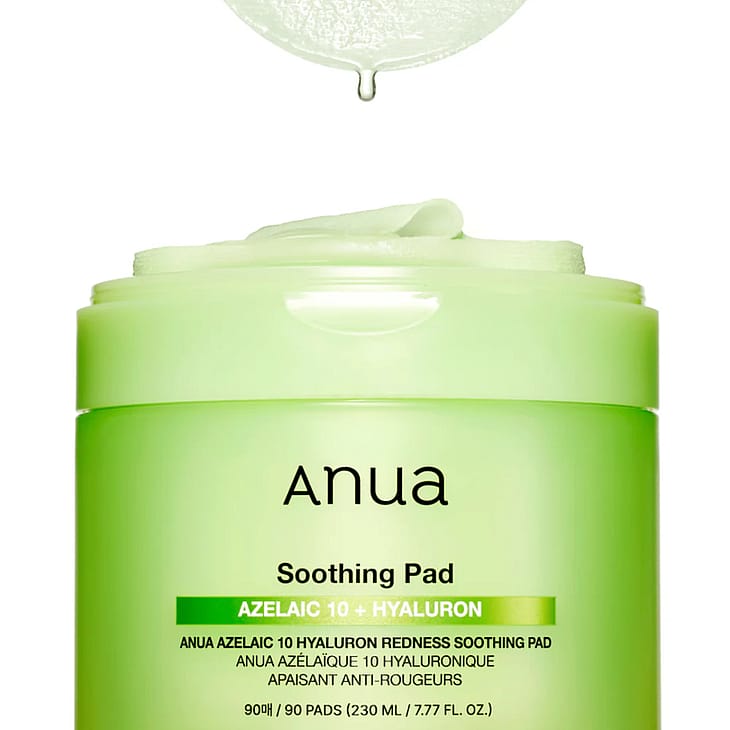Beroligende pads med azelainsyre og hyaluronsyre, der reducerer rødme og tilfører intensiv fugt for en mere jævn hudtone.