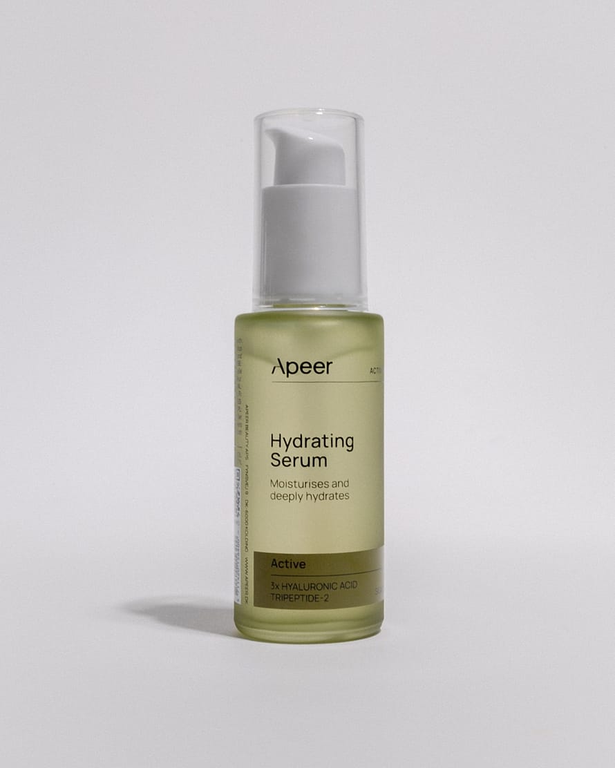 Apeer Hydrating Serum er et let serum, der indeholder en avanceret kombination af tre typer hyaluronsyre – meget lav, lav og mellem molekylevægt – som sikrer fugt i alle hudens lag.