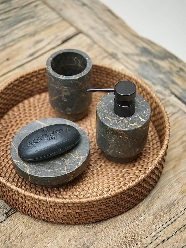 Den sorte Cino bakke fra Aquanova kombinerer praktisk opbevaring med et moderne og eksklusivt udtryk. Fremstillet i håndvævet rattan med en dyb sort nuance tilfører den kontrast og raffinement til dit badeværelse eller indretning.