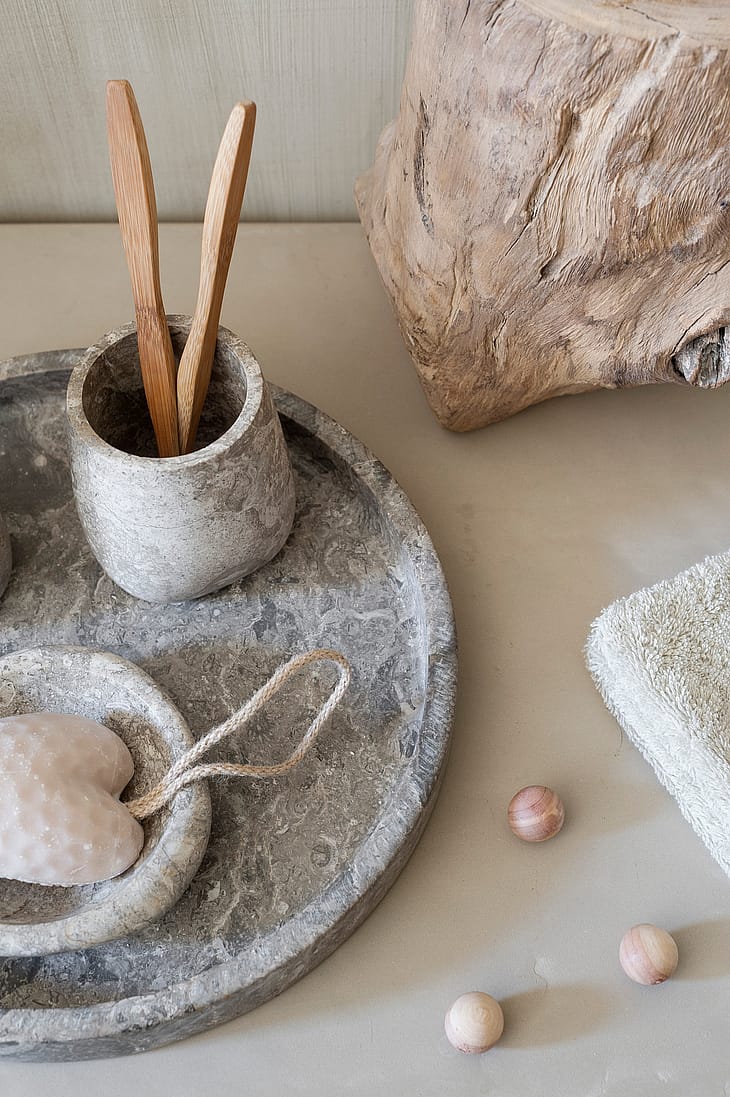 Invitér naturens skønhed ind på badeværelset med Conor sæbeskålen fra Aquanova. Denne smukke og håndlavede skål i beige marmor er ikke bare en praktisk løsning til din sæbe – den er også en elegant designdetalje, der løfter stemningen i hjemmet.