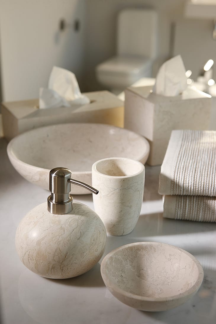 Forkæl dig selv med Luxor sæbedispenseren i lys marmor – en elegant detalje, der kombinerer funktion, naturlig skønhed og tidløs luksus.