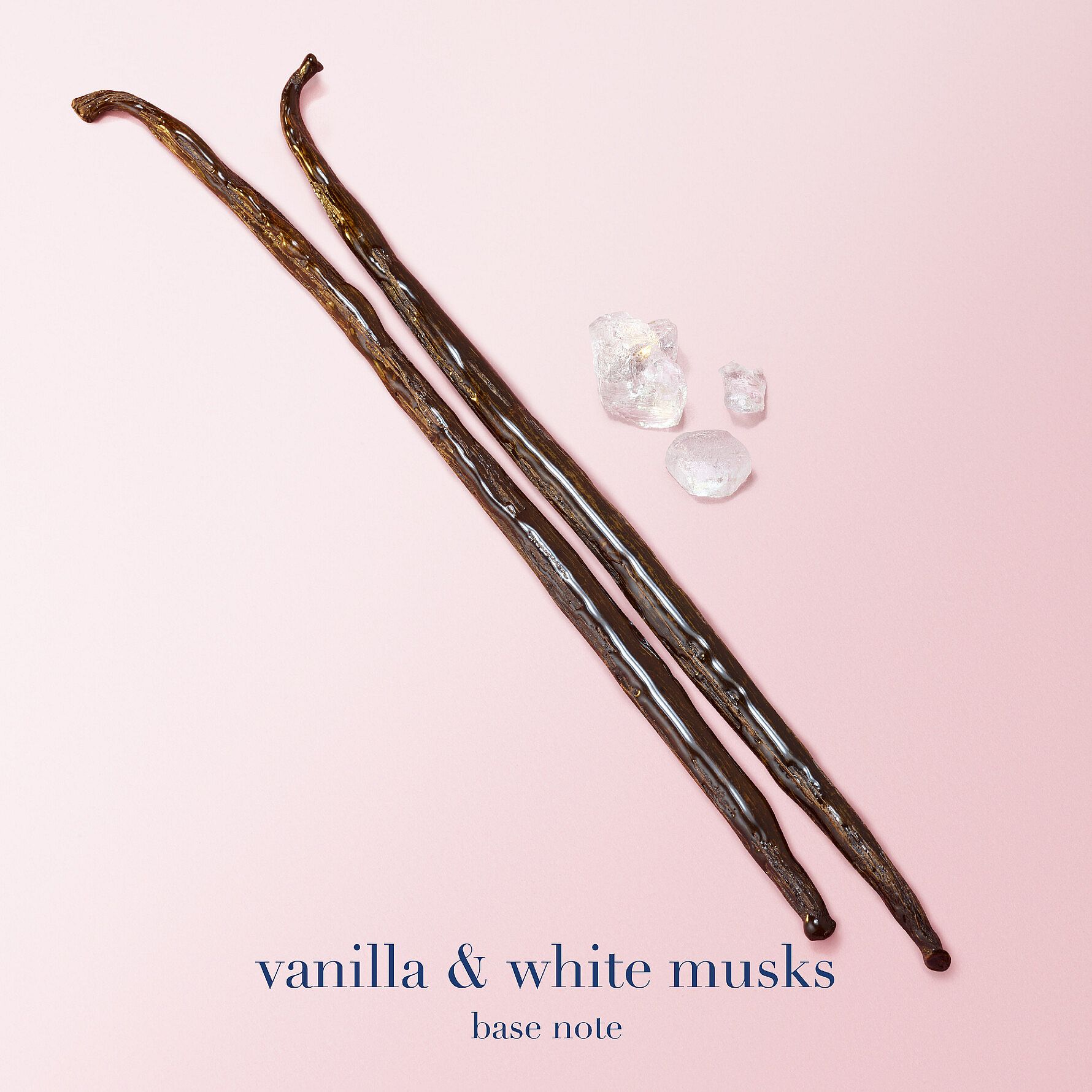 En blanding af hvidt træ og varmt cedertræ forstærker den sensuelle, beroligende vaniljebourbon-infusion i bunden med den beroligende effekt af hvid moskus.
