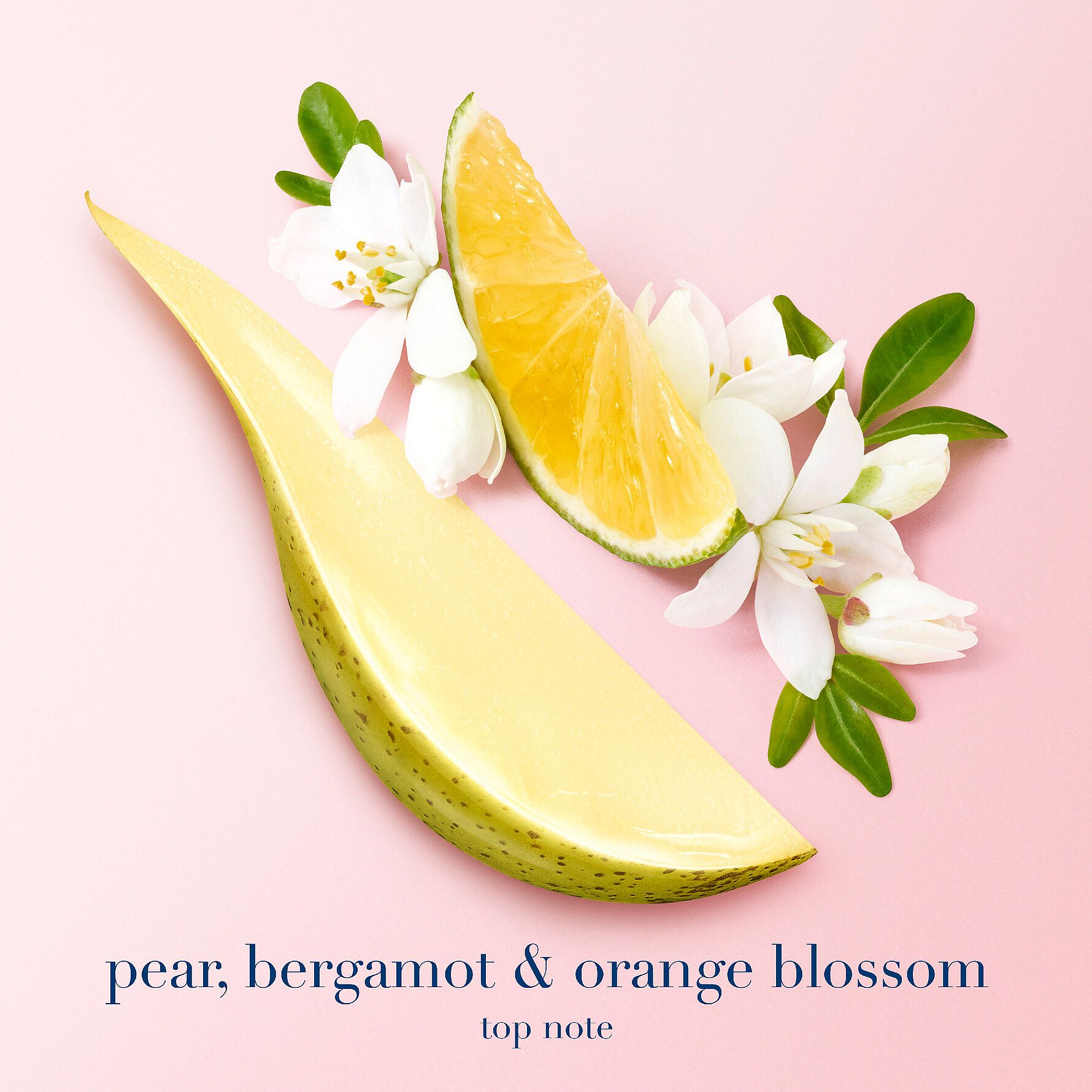 Duften åbner med en eksplosion af friskhed, saftig pæreakkord og livlig, aromatisk rabarberakkord.
