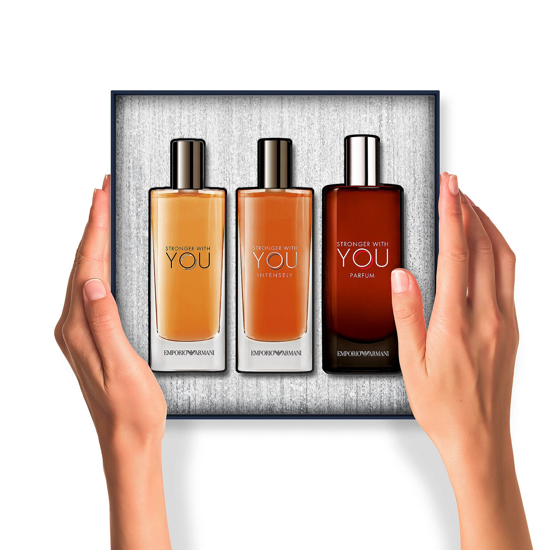Sættet inkluderer Stronger With You Eau de Toilette, Stronger With You Intensely Eau de Parfum og Stronger With You Parfum, hver i et 15 ml format. Sammen giver disse dufte mænd mulighed for at udforske forskellige facetter af maskulinitet: friskhed, intensitet og sensualitet.