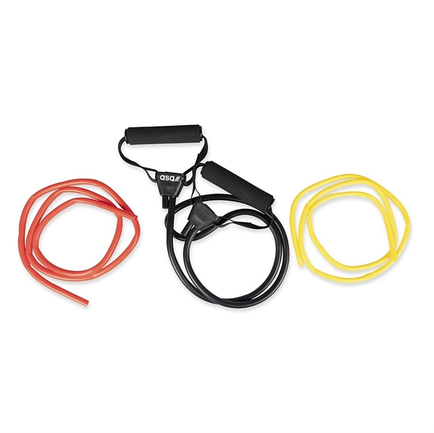 Du skifter selv mellem gul (5 kg.), rød (10 kg.) eller sort (14 kg.) elastik efter modtand og træningsbehov.