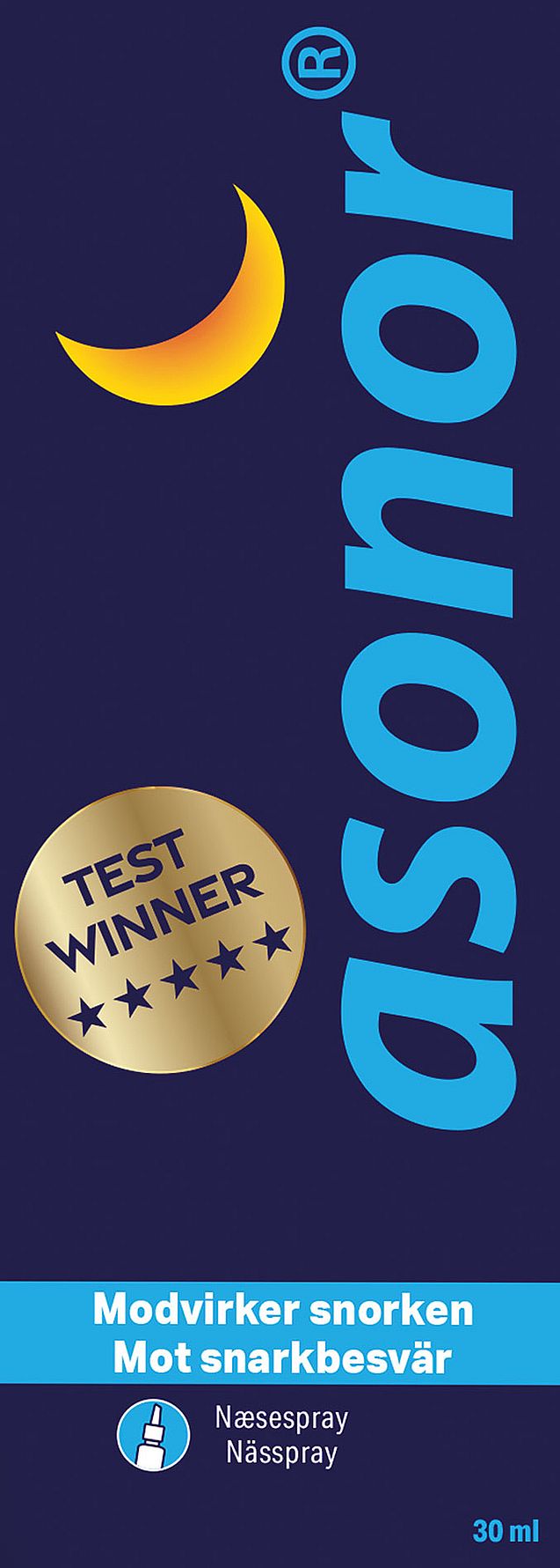 Testvindende Asonor fjerner årsagen til snorken. Det er en nem og effektiv behandling, som befrier dig og din partner for de mange gener og følgesygdomme, der er forbundet med snorken. Indikation (reg. lægemiddelstyrelsen): Asonor reducerer eller helt fjerner kraftig snorken med henblik på at reducere forekomsten af obstruktiv søvn apnø. Dosering: 4-6 pump af opløsningen i hvert næsebor ved sengetid. Opløsningen skal kunne mærkes i svælget. Virkningen af én behandling aftager efter ca. 6-8 timer. Indholdet rækker til ca. 25 behandlinger.