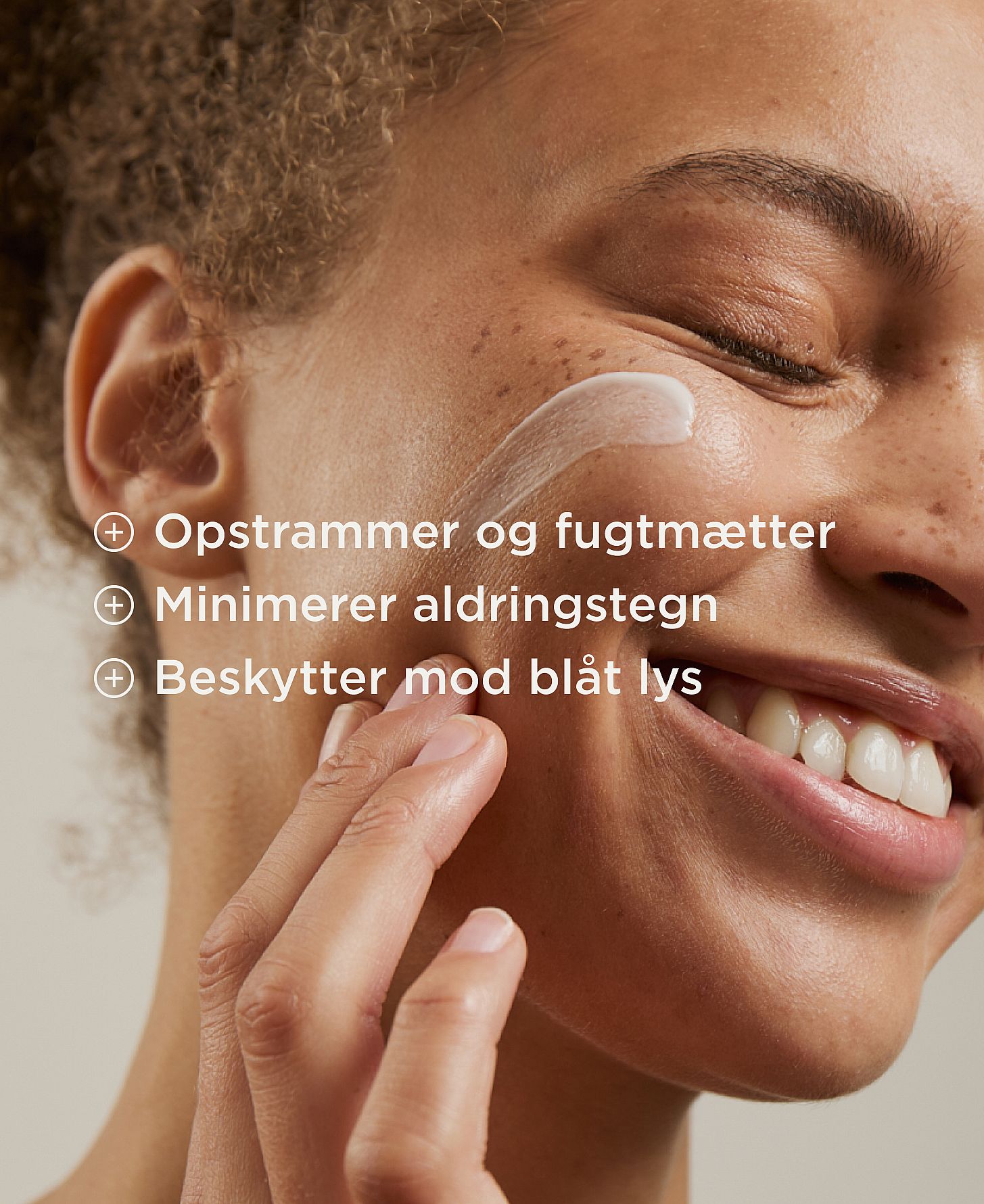 - Egenskaber: Opstrammer, fugtmætter, forbedrer spændstighed og tone, beskytter mod blåt lys