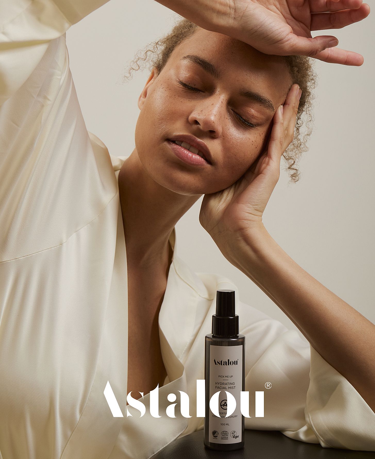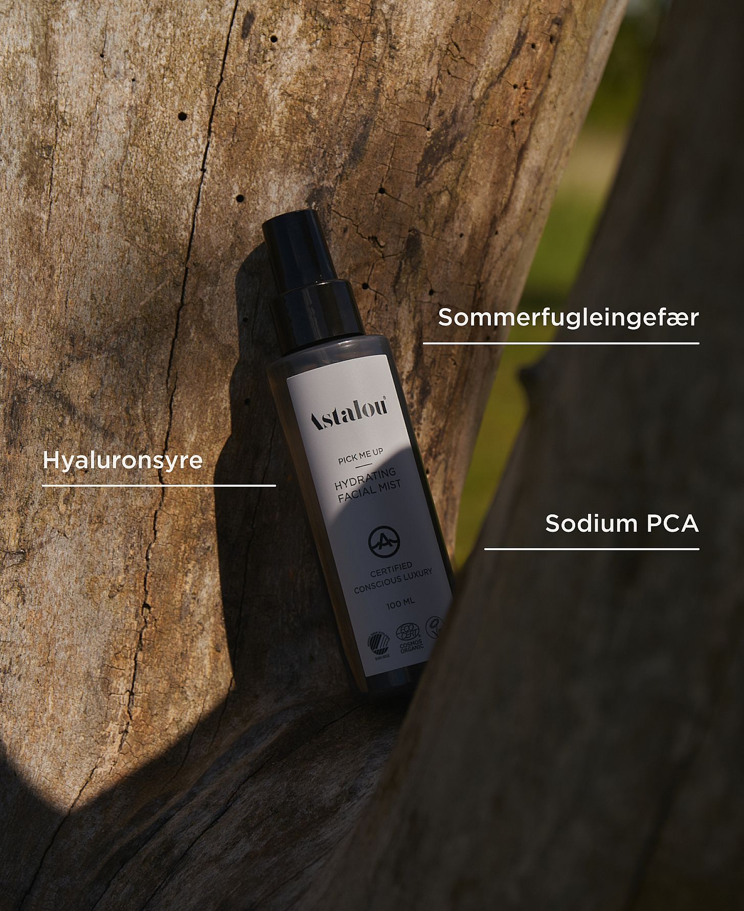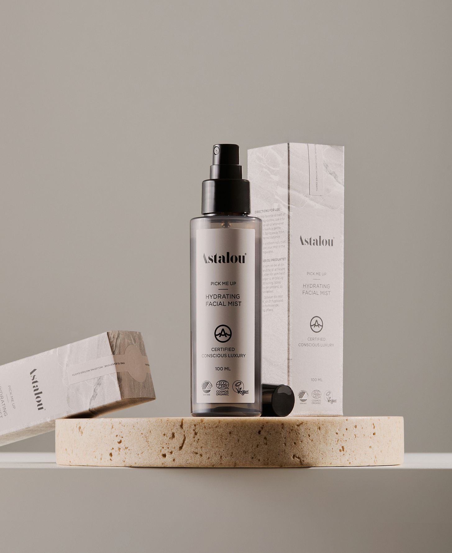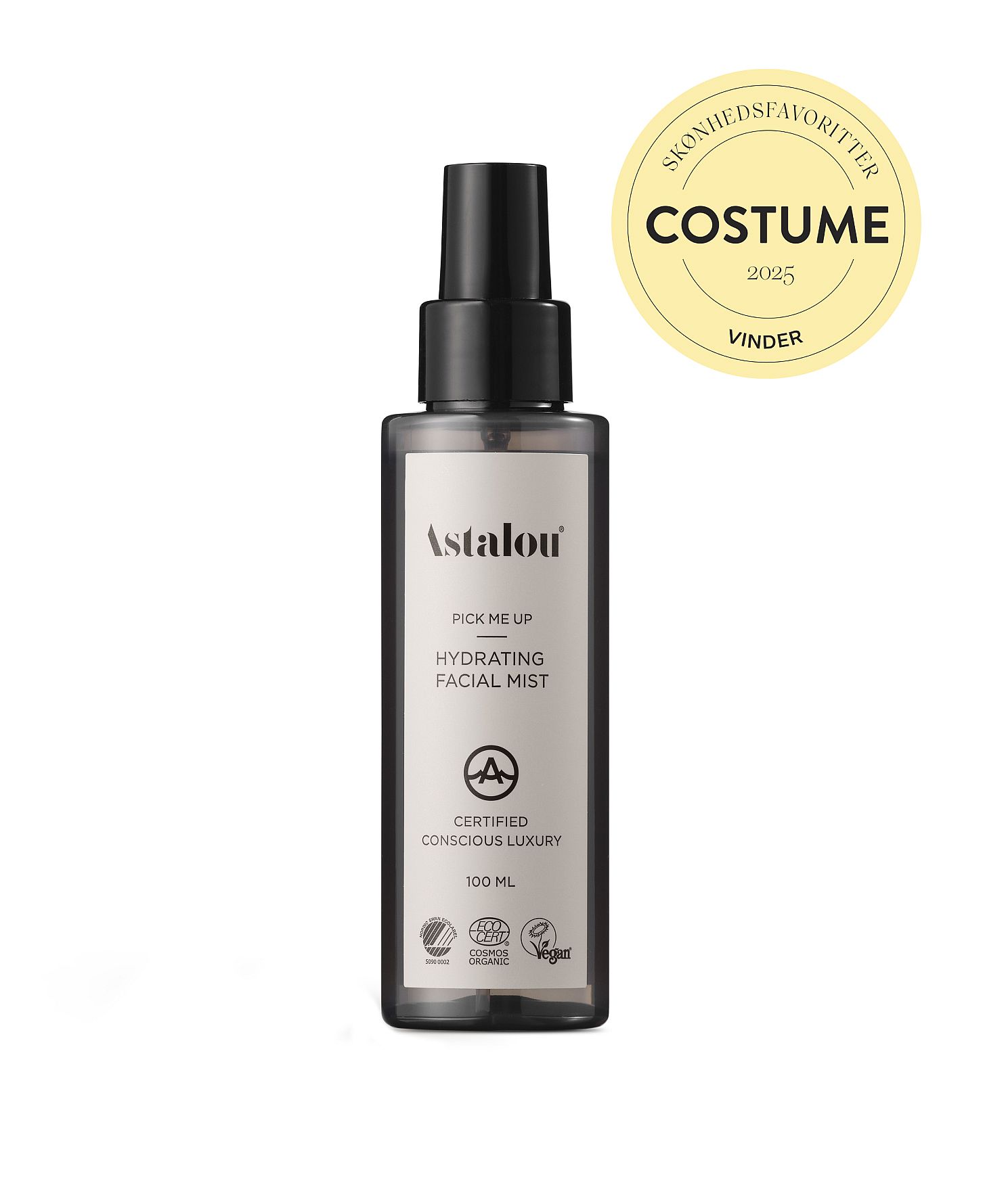 Astalou Pick Me Up Hydrating Facial Mist er en prisvindende, vægtløs ansigtsmist, der giver huden et øjeblikkeligt fugtboost og friskhed – uanset hvor du er. De fine, lette dråber føles som forfriskende støvregn og er tilsat stjerneingredienser som hyaluronsyre og ekstrakt af hvid sommerfugleingefær, der tilsammen tilfører intensiv fugt, reducerer fine linjer og rynker og beskytter huden mod blåt lys og frie radikaler.