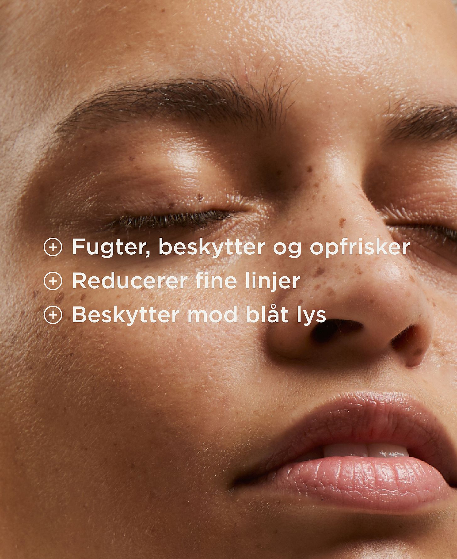 - Egenskaber: Opfrisker, giver fugt, reducerer fine linjer, beskytter mod blåt lys og frie radikaler