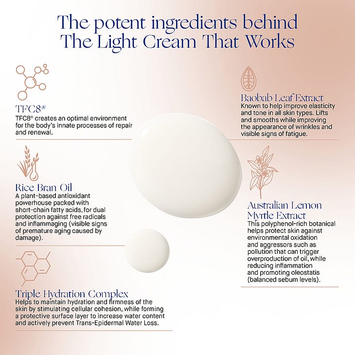 Inspireret af mere end 30 års videnskabelig innovation er The Light Cream en forfriskende, let emulsion, der udnytter kraften i vores egenudviklede TFC8®-teknologi til at hjælpe huden med at bevare sin fugtighed og matte finish.