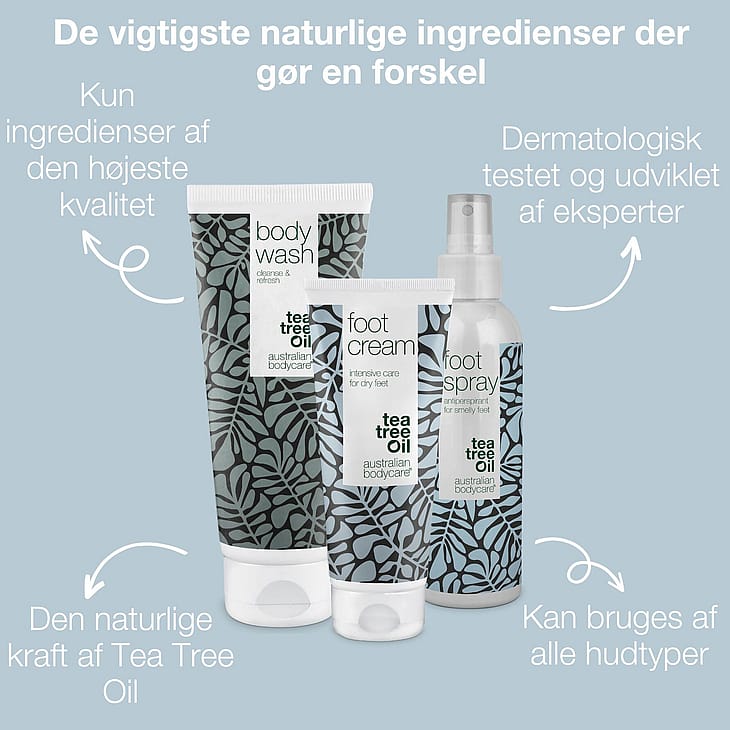 Produkterne er bl.a. beriget med naturlig Tea Tree Oil, der foruden den bakteriemodvirkende effekt, også modvirker den ubehagelige lugt fra sure tæer.