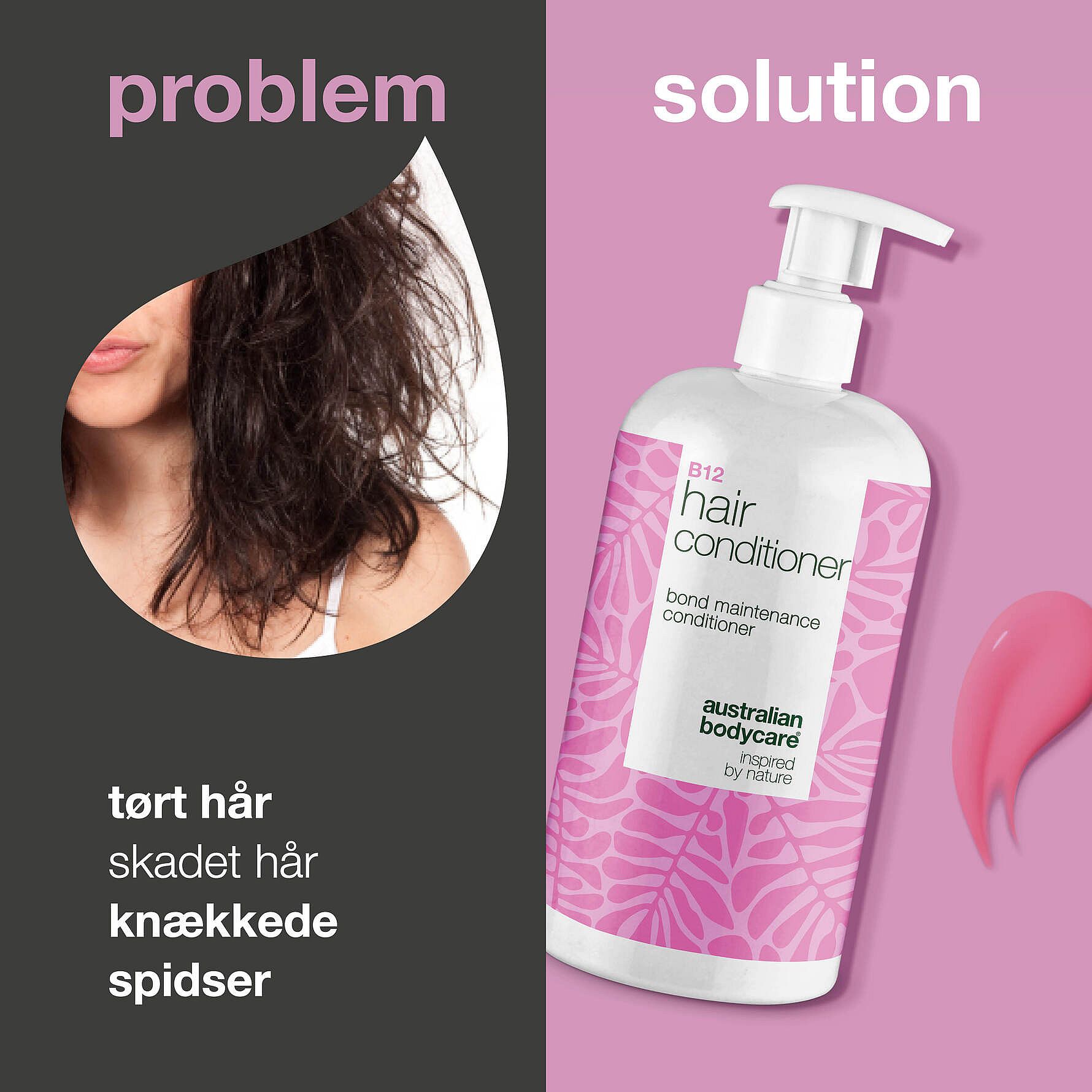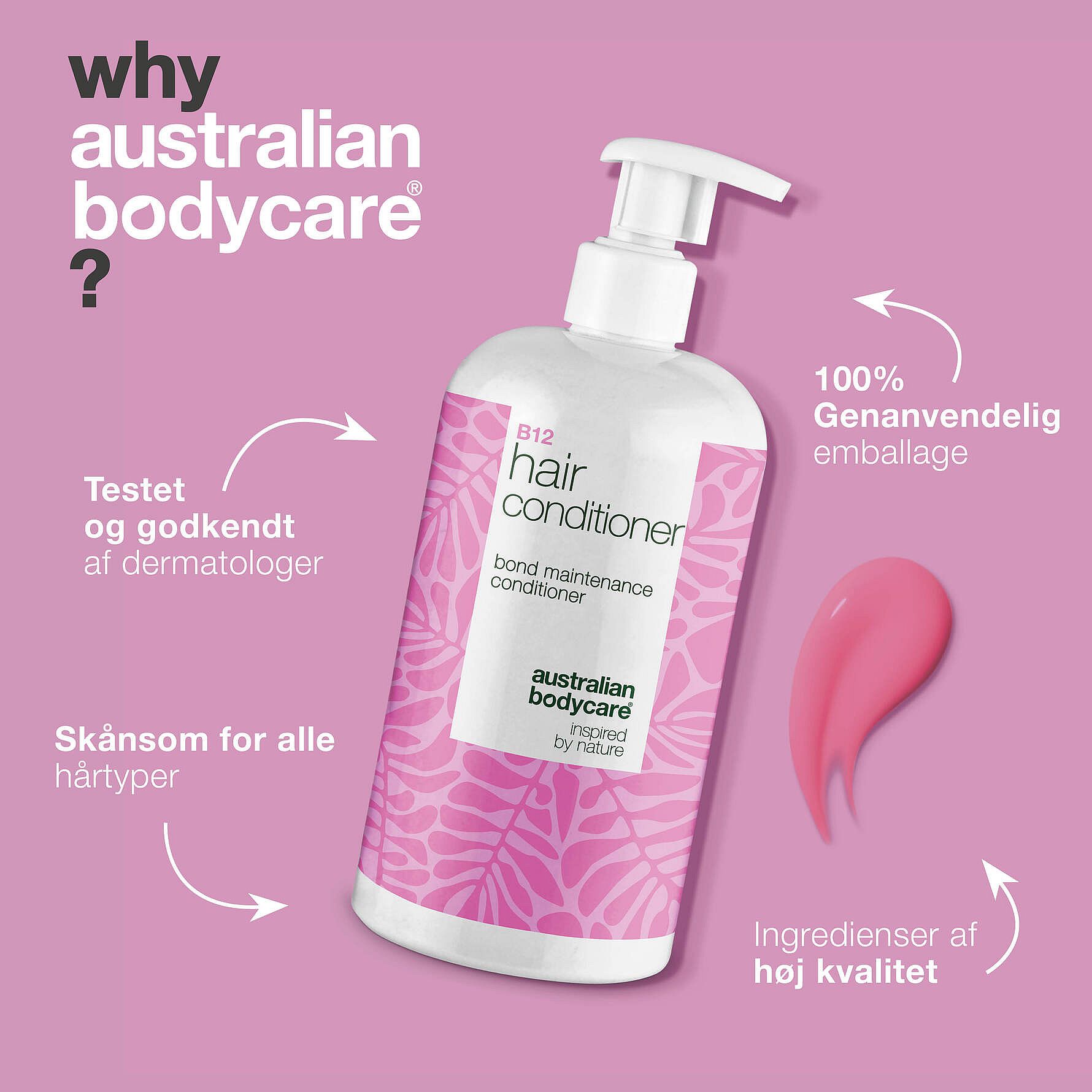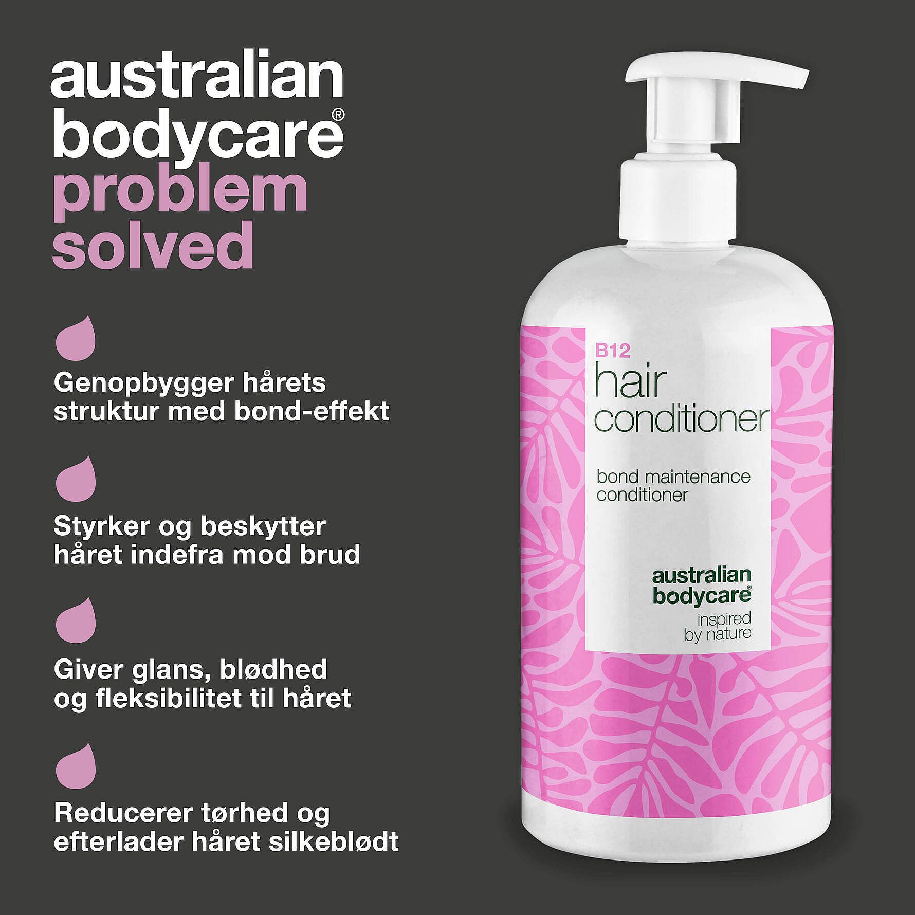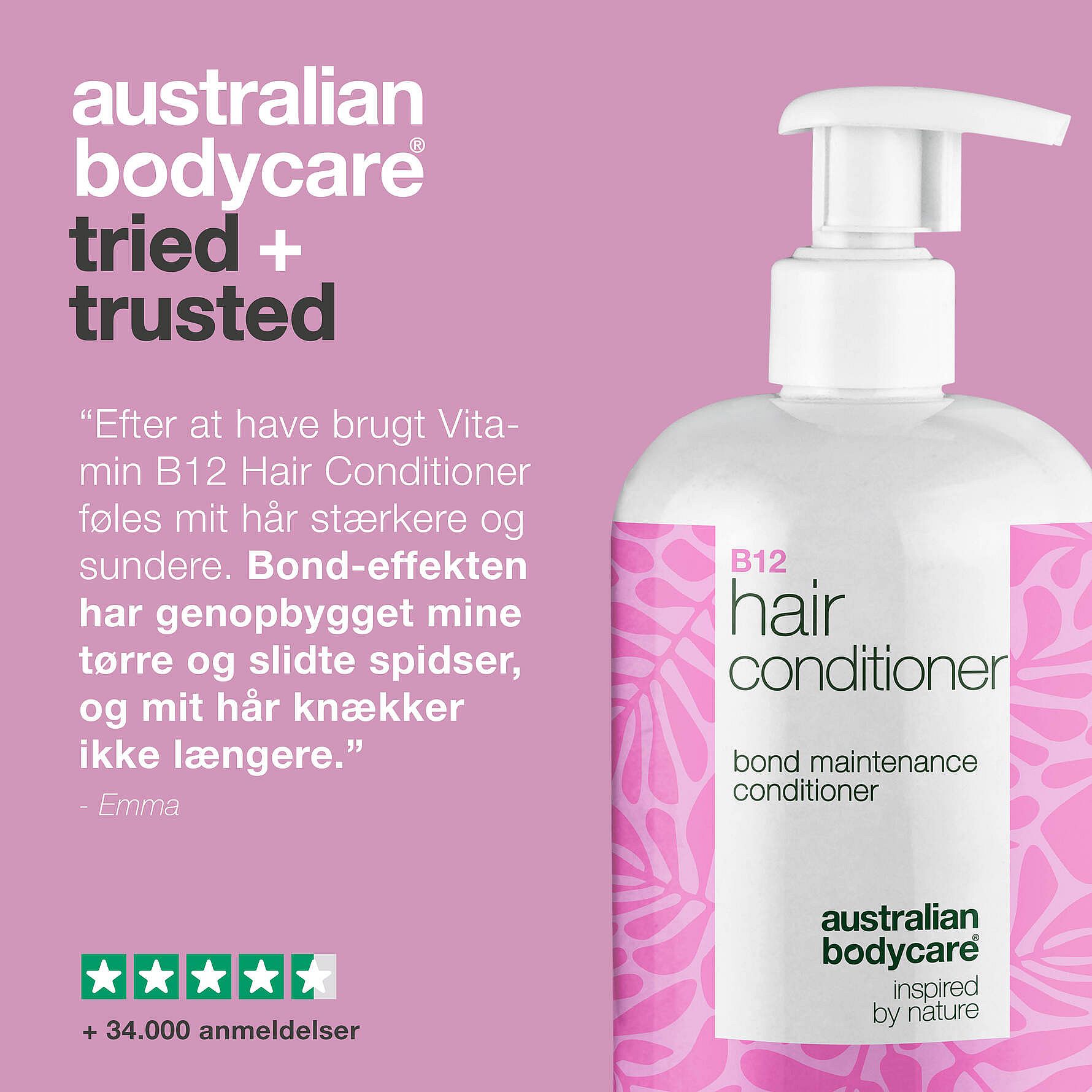 Vitamin B12 Hair Conditioner fra Australian Bodycare er udviklet med en bond-lignende teknologi, der genopbygger hårfiberen, forstærker bindingerne og beskytter håret fra rod til spids.