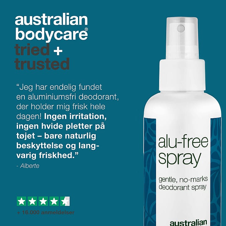 Deodorant Spray uden aluminium – Naturlig beskyttelse mod svedlugt Effektiv deodorant uden aluminium – mild mod huden, stærk mod svedlugt! Oplever du, at din nuværende deodorant irriterer huden eller efterlader hvide mærker på tøjet? Leder du efter en deodorant uden aluminium, der effektivt bekæmper svedlugt – og samtidig er skånsom mod huden? Så er denne deodorant spray fra Australian Bodycare det perfekte valg for dig.