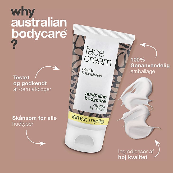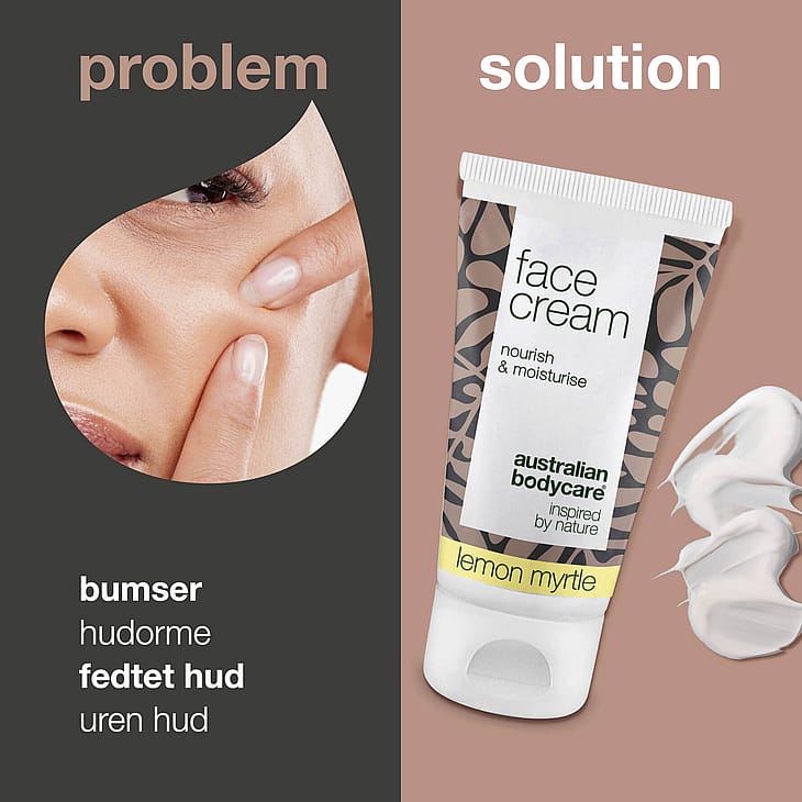 Ansigtscreme til daglig fugtpleje af huden. Australian Bodycare Face Cream kan bruges til både fedtet hud og tør hud. 100% naturlig Tea Tree Oil og Lemon Myrtle modvirker bumser, hudorme og uren hud.