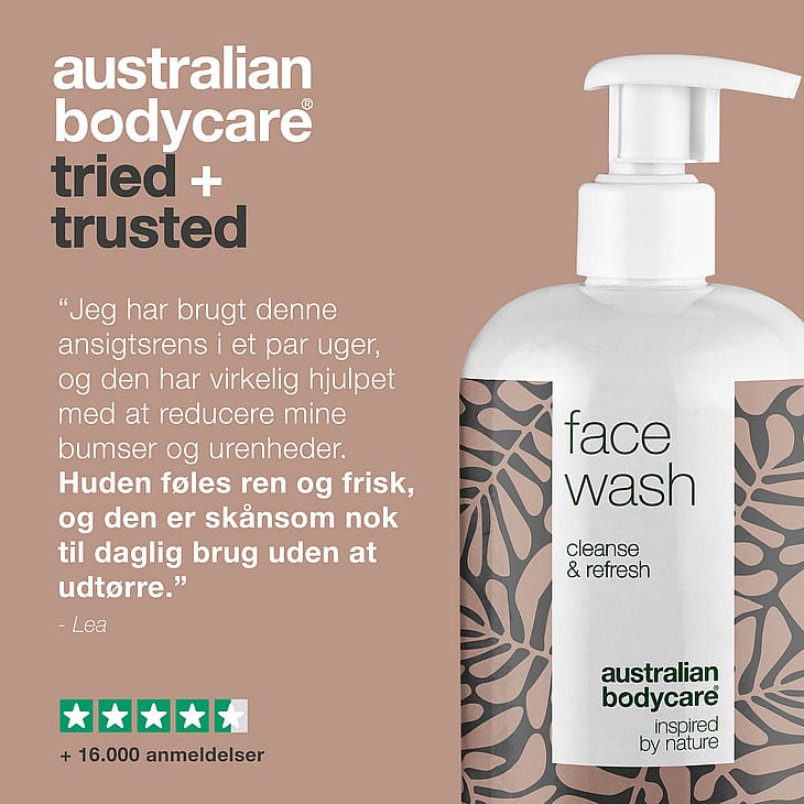 Vi anbefaler at kombinere Face Wash med Face Tonic, Face Cream og Spot Stick fra samme serie hos Australian Bodycare.