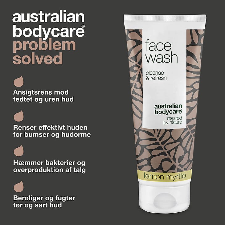 Ansigtsrens til daglig brug mod uren hud, bumser og hudorme. Australian Bodycare Face Wash indeholder 100% naturlig Tea Tree Oil og Lemon Myrtle, som holder huden ren og sund. Egnet til alle hudtyper.
