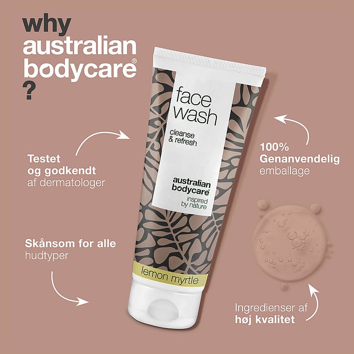 Det naturlige aktiv Tea Tree Oil er tilsat for sine bakteriemodvirkende egenskaber, der er velegnet til en lang række hudproblemer. Desuden er ansigtsrensen tilsat den fugtgivende ingrediens Lemon Myrtle. Lemon Myrtle bidrager med en frisk citrusduft og tilfører desuden huden C-vitamin for flot glød. Face Wash er et godt valg, hvis du døjer med bumser og hudorme eller tør hud.