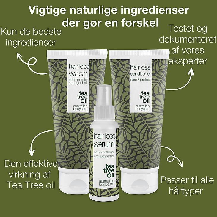 Hair loss wash: Aqua/Water, Sodium Laureth Sulfate, Glycerin, Cocamidopropyl Betaine, PEG-7 Glyceryl Cocoate, Glycol Distearate, Melaleuca Alternifolia (Tea Tree) Leaf Oil, PEG-4 Rapeseedamide, Phenoxyethanol, Disodium Cocoamphodiacetate, Citric Acid, Sodium Benzoate, Potassium Sorbate, Coco-Glucoside, Guar Hydroxypropyltrimonium Chloride, Hydrogenated Castor Oil, Tocopherol, Tetrasodium Iminodisuccinate, Glyceryl Oleate, Curcuma Longa (Turmeric) Callus Conditioned Media, Sodium PCA, Amaranthus Caudatus Seed Extract, Sodium Lactate, Biotin, Arginine, Aspartic Acid, PCA, Benzoic Acid, Glycine, Alanine, Serine, Valine, Isoleucine, Proline, Threonine, Gluconolactone, Sodium Hydroxide, Histidine, Phenylalanine, Calcium Gluconate, Sodium Chloride, Limonene. Hair loss serum: Aqua/Water, Alcohol Denat., Butylene Glycol, PEG-40 Hydrogenated Castor Oil, Curcuma Longa (Turmeric) Callus Conditioned Media, Phenoxyethanol, Panthenol, Glycerin, Triethanolamine, Pantolactone, Sodium PCA, Sodium Lactate, 4-Terpineol, Biotin, Ethylhexylglycerin, Niacinamide, Arginine, Melaleuca Alternifolia (Tea Tree) Leaf Oil, Aspartic Acid, PCA, Tasmannia Lanceolata Fruit Extract, Gluconolactone, Glycine, Alanine, Amaranthus Caudatus Seed Extract, Serine, Valine, Sodium Benzoate, Isoleucine, Proline, Terminalia Ferdinandiana (Kakadu Plum) Fruit Extract, Threonine, Histidine, Phenylalanine, Calcium Gluconate. Hair loss conditioner: Aqua/Water, Cetearyl Alcohol, Caprylic/Capric Triglyceride, Glycerin, Shea Butter Ethyl Esters, Distearoylethyl Dimonium Chloride, Behentrimonium Methosulfate, Phenoxyethanol, Panthenol, Quaternium-87, Polyquaternium-37, Citric Acid, 4-Terpineol, Caprylyl Glycol, Tocopherol, Melaleuca Alternifolia (Tea Tree) Leaf Oil, Tetrasodium Iminodisuccinate, Sodium PCA, Curcuma Longa (Turmeric) Callus Conditioned Media, Amaranthus Caudatus Seed Extract, Sodium Lactate, Arginine, Aspartic Acid, Pantolactone, PCA, Terminalia Ferdinandiana (Kakadu Plum) Fruit Extract, Glycine, Alanine, Sodium Benzoate, Serine, Valine, Isoleucine, Proline, Threonine, Gluconolactone, Histidine, Phenylalanine