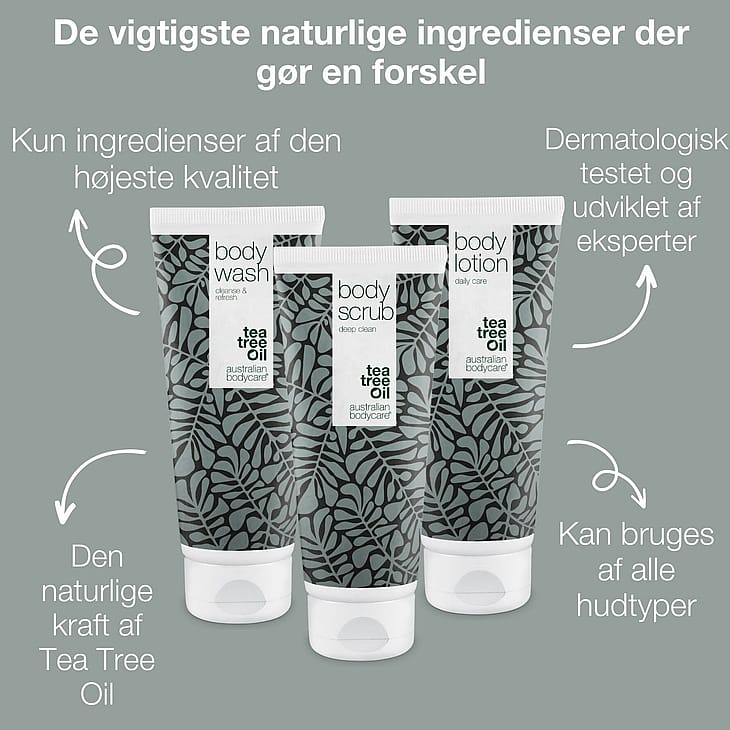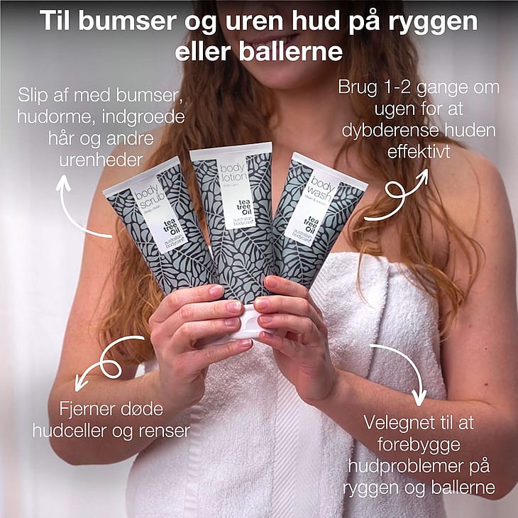 værdi af 379,85 kr.3 kropsprodukter til eksfoliering af bumser på ryggen og ballerne. Eksfolieringspakken fra Australian Bodycare indeholder shower gel, body lotion og body scrub og modvirker bl.a. uren hud på ryggen.