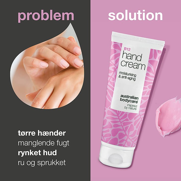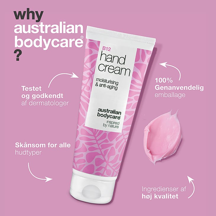 Australian Bodycare's hudeksperter har udviklet denne B12 håndcreme til dig, der ønsker både beskyttelse, blødhed og mindre synlige rynker på hænderne.